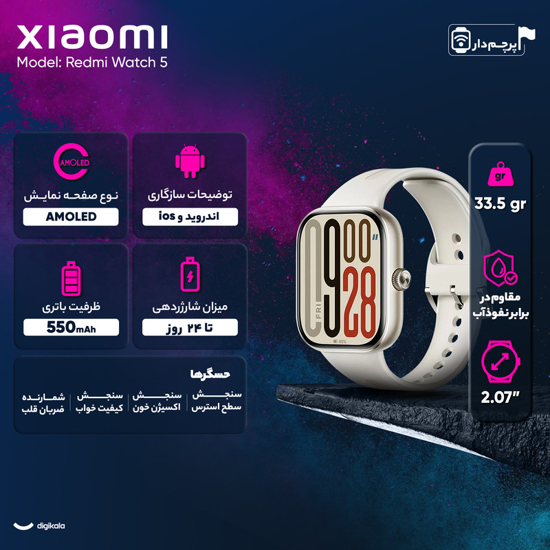 مقاوم در برابر نفوذ آب تا عمق 50 متری / مجهز به دو میکروفون / دارای 150 حالت ورزشی