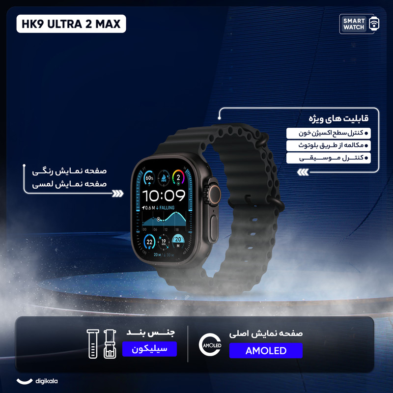 ساعت هوشمند مدل HK9 ULTRA 2 MAX دارای قابلیت های صفحه نمایش رنگی، صفحه نمایش لمسی، کنترل موسیقی (Music Player)، کنترل سطح اکسیژن خون، قابلیت مکالمه از طریق بلوتوث، پشتیبانی از زبان فارسی در منو و سیستمعامل بند سیلیکون