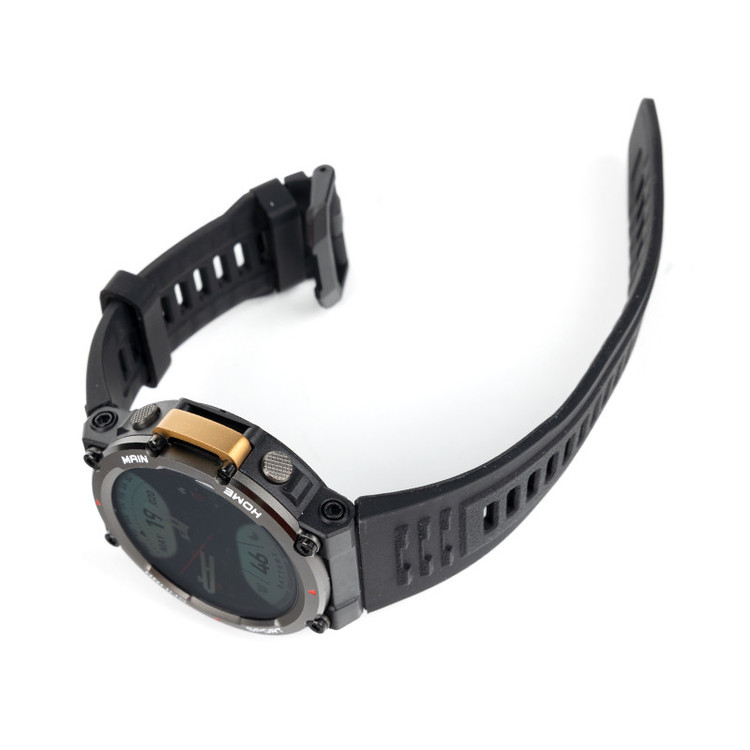 بدنه ساعت استیل ضد زنگ به رنگ مشکی و دارای یک بند سیلیکونی مشکی با سگک قلاب دار