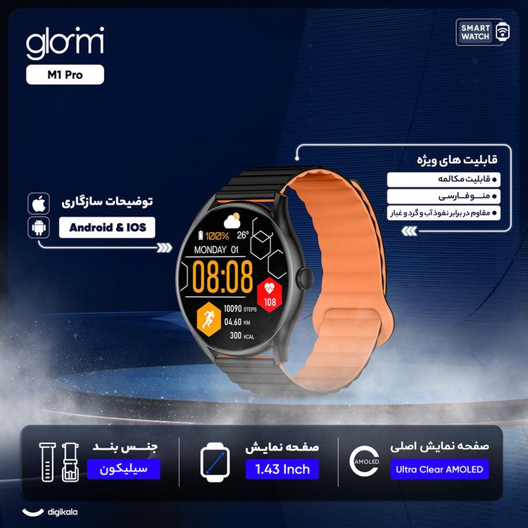 ساعت هوشمند گلوریمی مدل M1 Pro دارای قابلیت های صفحه نمایش رنگی، صفحه نمایش لمسی، کنترل موسیقی، کنترل سطح اکسیژن، بند سیلیکونی
