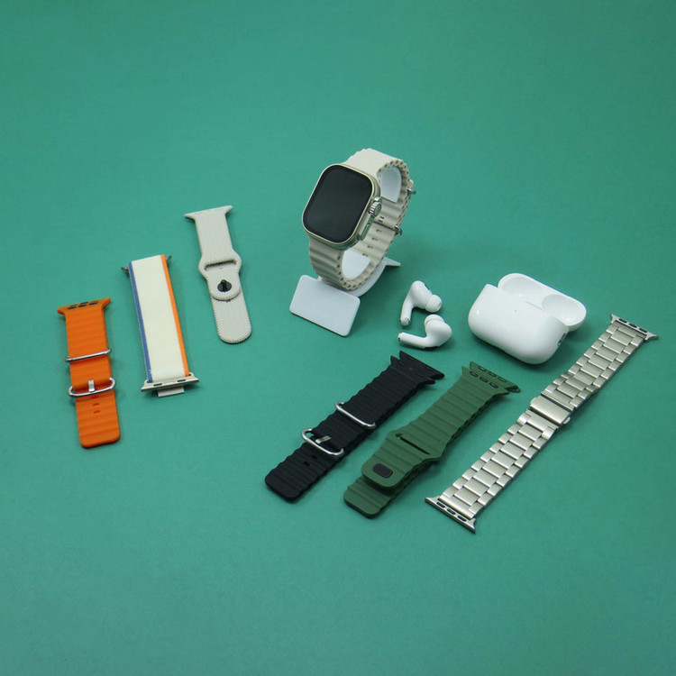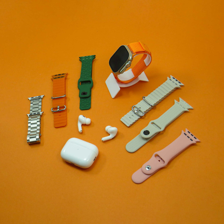 دارای هفت بند با طرح ها و رنگ های متفاوت + هندزفری Airpod pro طرح اپل