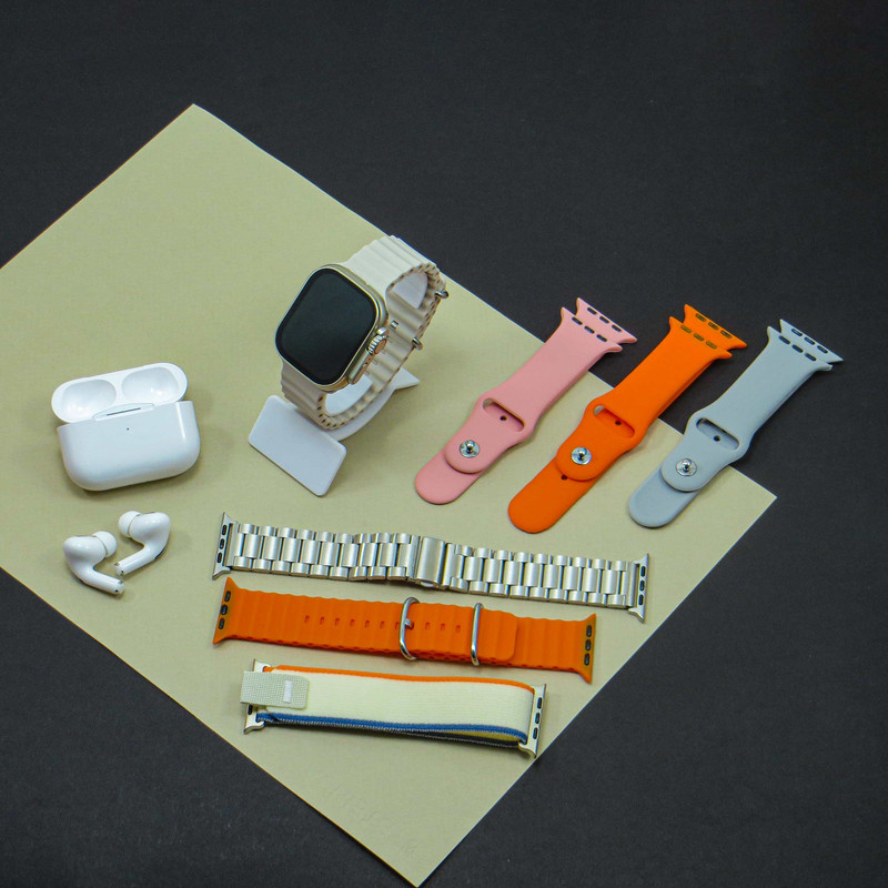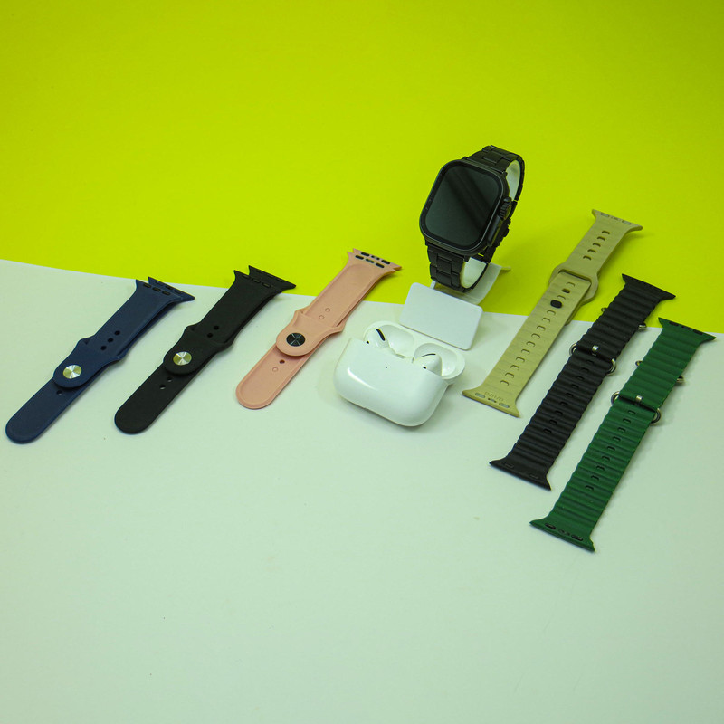 دارای هفت بند با طرح ها و رنگ های متفاوت + هندزفری Airpod pro طرح اپل