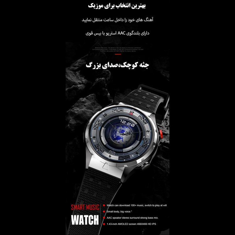 صفحه نمایش رنگی , صفحه نمایش لمسی , کنترل موسیقی (Music Player) , قابلیت مکالمه از طریق بلوتوث , پشتیبانی از زبان فارسی در منو و سیستمعامل , قابلیت تغییر طرح ساعت یا تم