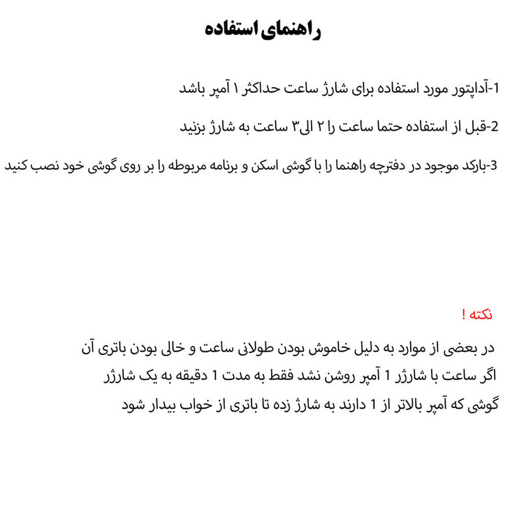 آداپتور مورد استفاده برای شارژ ساعت حداکثر ۱ آمپر باشد , بارکد موجود در دفترچه راهنما را با گوشی اسکن و سپس بر روی گوشی خود نصب کنید , قبل از استفاده حتما ۲-۳ ساعت ساعت را شارژ کنید