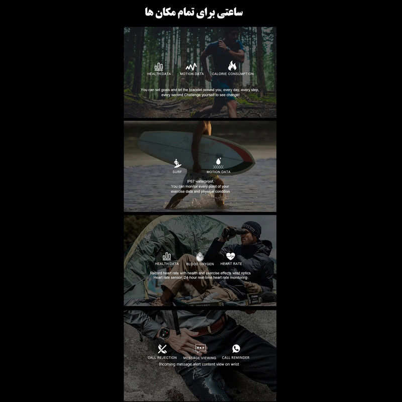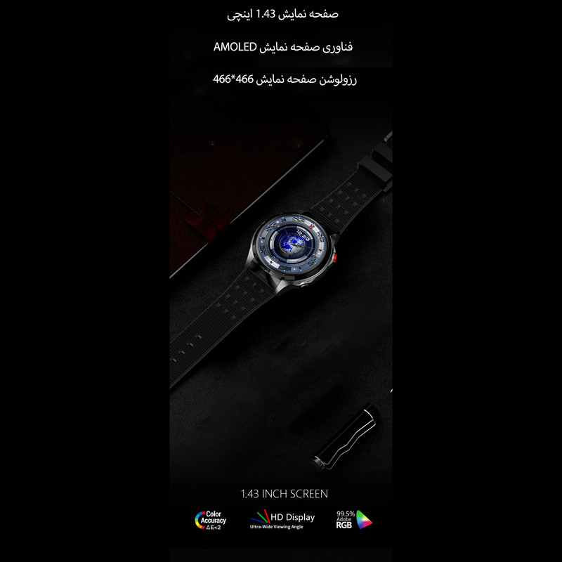 صفحه نمایش رنگی , صفحه نمایش لمسی , کنترل موسیقی (Music Player) , قابلیت مکالمه از طریق بلوتوث , پشتیبانی از زبان فارسی در منو و سیستمعامل , قابلیت تغییر طرح ساعت یا تم