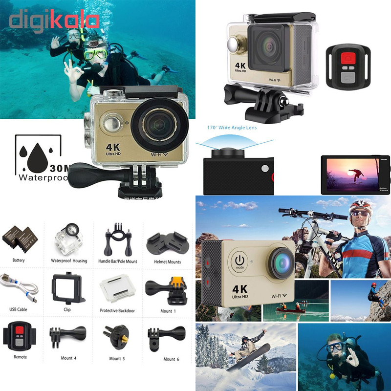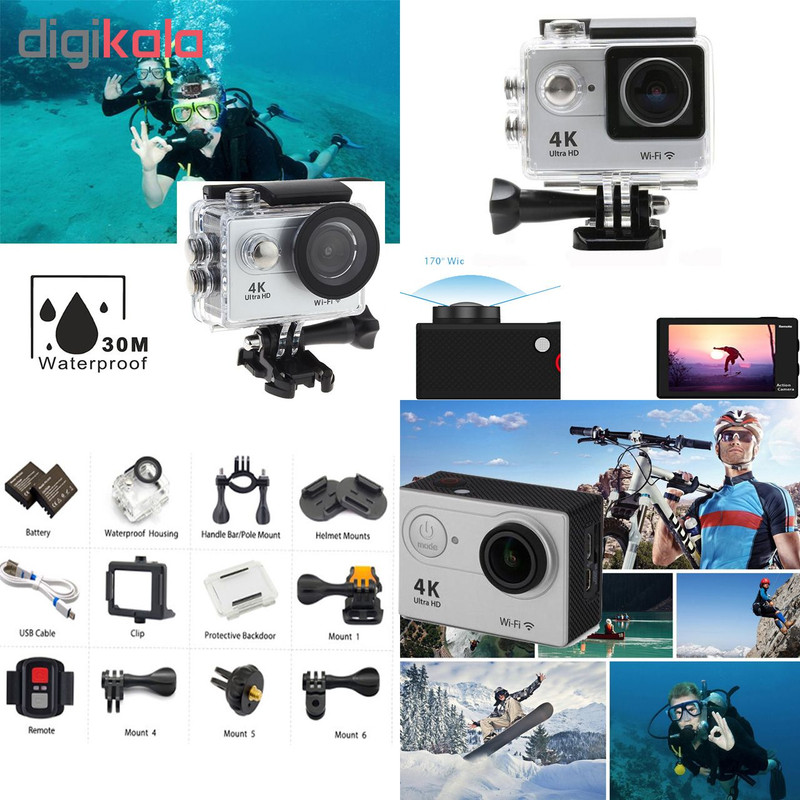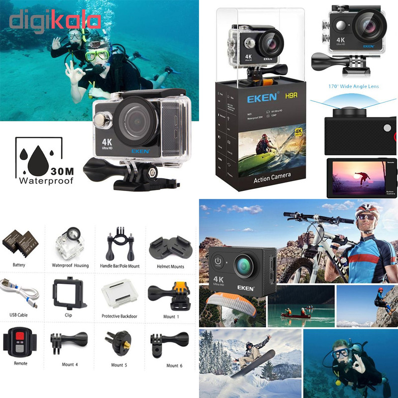 مدل H9r برند EKEN جزو پرفروشترین دوربین های ورزشی جهان میباشد، زیرا به دلیل داشتن کیفیت بالا و قیمت پائین طرفداران بسیاری را در جهان به خود جلب کرده . EKEN H9R قادر است با زاویه دید 170 درجه و کیفیت واقعی 4K@25fps فیلم برداری و با 12Mp عکاسی انجام دهد. این دستگاه به دلیل داشتن فیلترهای نویز گیر دیجیتالی صدا میتواند صدا های اضافی پیرامون مانند وزش باد را تا حد زیادی حذف و صدایی واضح از اطراف و طبیعت را ضبط کند. یکی دیگر از دلایل موفقیت این دوربین همراه داشتن لوازم جانبی ضروری مانند کاور ضد آب ، ریموت کنترل بسیاری از متعلقات ضروری میباشد که در برند های دیگر به صورت جداگانه (با ارائه هزینه) تهیه میشوند،در واقع به جرات میتوان گفت که این مجموعه شامل کاملترین لوازم جانبی همراه در بین تمامی دوربین های ورزشی میباشد. دوربین ورزشی EKEN H9R با کمک نرم افزار مخصوص تلفن همراه (قابل دانلود از STORE) میتواند از طریق WiFi به گوشی تلفن همراه متصل و تصاویر زنده را به گوشی ارسال کرده و کاربر نیز قادر است کنترل دوربین را از طریق گوشی موبایل بدست بگیرد.همچنین دارای یک صفحه نمایش 2 اینچی برای نمایش فایل های ضبط شده بر روی مموری کارت و دسترسی به تنظیمات منو بوده و از طریق خروجی Micro HDMI میتوان به تلوزیون و یا هر دستگاه دیگری متصل و از آن بهره گرفت. همچنین یک کارت حافظه 32 گیگ نیز همراه محصول برای شما ارسال خواهد شد.