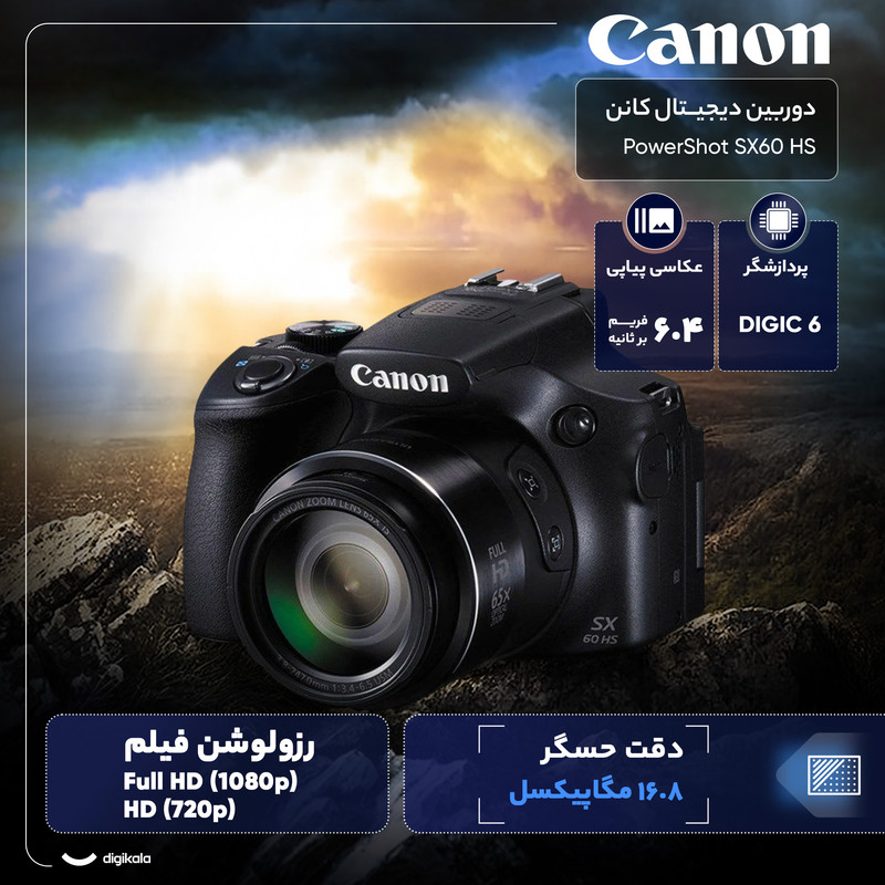 دوربین دیجیتال کانن مدل PowerShot SX60 HS با لنز قدرتمند ۲۳ تا ۱۳۶۵ میلیمتری و زوم اپتیکال ۶۵ برابری، ابزاری توانمند برای ثبت سوژههای دور، طبیعتگردی و عکاسی روزمره است و ارزش خرید بالایی در میان دوربینهای سوپرزوم دارد.