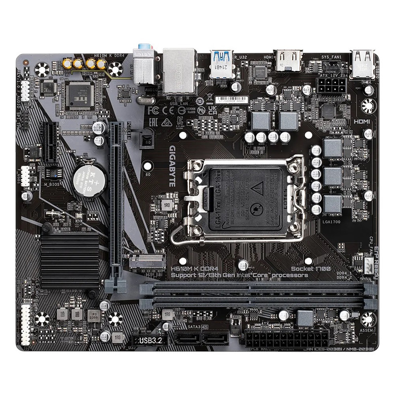 مادربرد گیگابایت H610M K DDR4 (rev. 1.0) یک مادربرد حرفهای مبتنی بر چیپست H610 اینتل از سری «گیگابایت» (Gigabyte) است. این مادربرد با فرم فکتور MicroATX از اینتل پشتیبانی میکند.گیگابایت در ساخت این مادربردها از اجزای بادوام و مرغوب رده سرور در مدار تغذیه آن استفاده کرده است.این مادربرد حداکثر از 64 گیگابایت حافظه رم DDR4 با فرکانس تا 3200 مگاهرتز تحت پیکربندی دوکاناله پشتیبانی میکند. شکافهای توسعه متشکل از یک PCI Express x16، یک عدد PCI Express x1 است. درگاههای مخصوص وسایل ذخیرهسازی متشکل از چهار SATA 6Gb/s و یک عدد کانکتور M.2 با پشتیبانی از هر دو SSDهای PCIe x4/x2 و SATA است. این مادربرد دارای نورپردازی RGB LED قابل شخصیسازی در نواحی مختلف است، امکان وصل کردن و هماهنگسازی نوار RGB نیز وجود دارد؛ برنامه RGB Fusion امکان شخصیسازی و هماهنگسازی نورپردازی را در کنار پشتیبانی از جلوههای نمایشی متعدد ارائه میکند.گیگابایت در این مادربرد از راهکار صوتی اختصاصی باکیفیت با بهرهگیری از پردازنده صوتی Realtek® Codec، خازنهای مخصوص صدا، آمپلیفایر، مدار ایزوله و تقویتکننده هوشمند هدفون بهره گرفته است. به کمک برنامه مکمل Smart Fan 6 و هدرهای فن متعدد، میتوان بر عملکرد خنکسازی سیستم و فنهای متعدد نظارت کرد. همچنین امکان کنترل و شخصیسازی فعالیت فنها وجود دار،. فناوری FAN STOP نیز امکان توقف هوشمند فنها را فراهم میکند.
