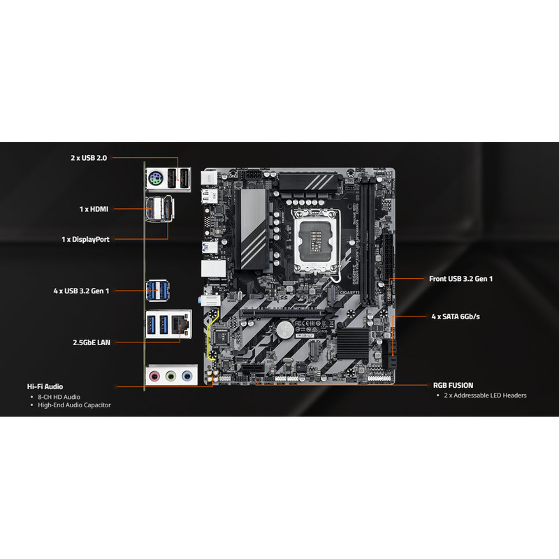 توضیحات تکمیلی پورتها : یک پورت PS/2 برای کیبورد/ماوس / یک پورت HDMI / یک پورت DisplayPort / چهار پورت USB 3.2 Gen 1 / دو پورت USB 2.0/1.1 / یک پورت RJ-45 / سه جک صوتی