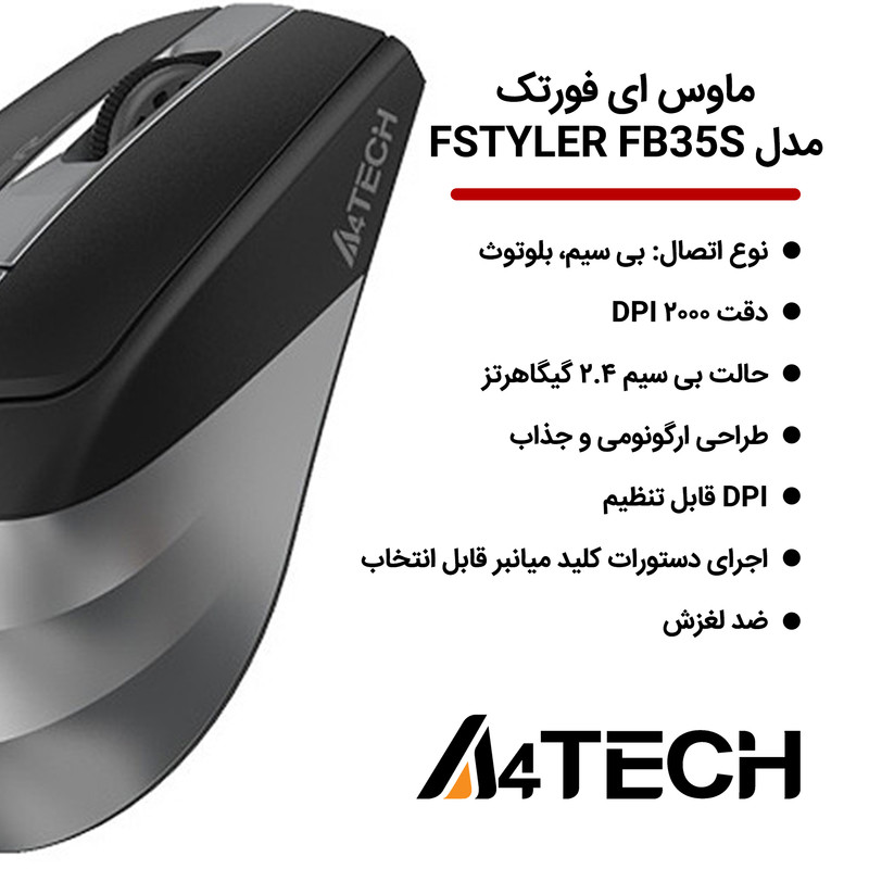 ماوس ای فورتک مدل FSTYLER_FB_35S با طراحی و ویژگی های فوق العاده تولید و عرضه شده و از جدیدترین متددها بهره میبرد تا سهولت در کار را بیشتر کند. این ماوس دو حالته هم از طریق بلوتوث و هم به صورت بی سیم ( وایرلس ) متصل میشود. مزید دیگر این ماوس متصل شدن همزمان به 4 دستگاه است ( از طریق سویچ )