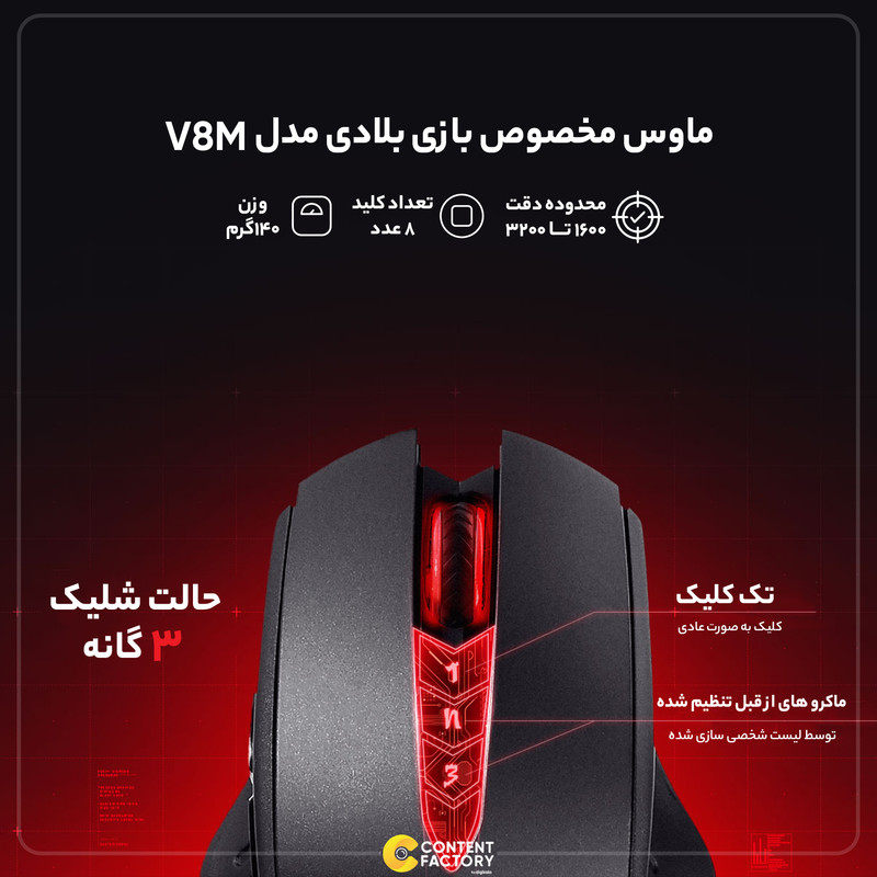 A4tech یکی از بزرگ ترین شرکت های تولید کننده تجهیزات و لوازم جانبی کامپیوتر در جهان می باشد. این شرکت محصولات گیمینگ خود را با نام تجاری Bloody وارد بازار کرده است. در این محصولات از جدیدترین تکنولوژی های روز دنیا و بهترین متریال استفاده شده است. ماوس گیمینگ بلودی V8M دارای 6 حالت تیراندازی در بازی های اکشن می باشد. ماوس A4tech V8M با دقت 3200 CPI ، یکی از دقیق ترین ماوس های موجود در بازار می باشد. ماوس های گیم بلودی مزیت منحصر به فردی دارند و آن داشتن سرعت بی نظیر موتور بازی در سراسر دنیا است و شما می توانید در بازی اهدافتان را با سرعت و دقت بیشتری مورد اصابت قرار بدهید.
