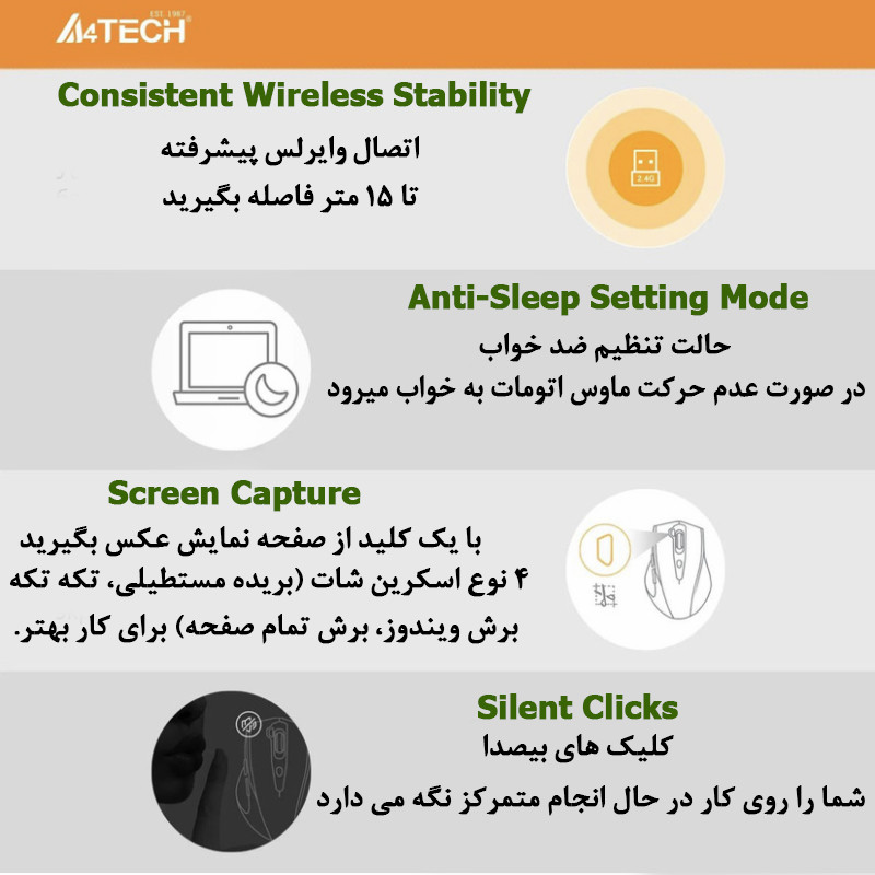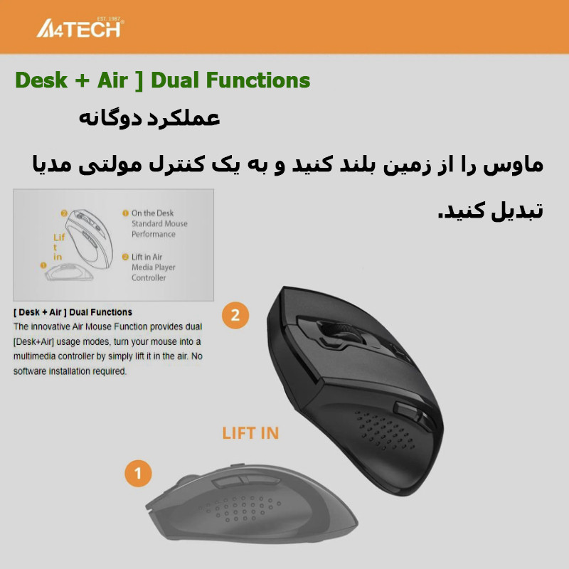 جدیدترین محصول ای فورتک مدل G7-810S-AIR2 طراحی 2025 با جدیدترین متدود روز دنیا توسط ای فورتک طراحی و تولید شده است. این ماوس با دو دانگل طراحی شده است دانگل اول USB برای متصل شدن ماوس به کامپیوتر و لپ تاپ است و دانگل دوم از نوع TYPE-C است برای متصل شدن ماوس به گوشی و تبلت است. این ماوس با طراحی ارگونومیک منطبق با گودی دست کاربر طراحی شده است.این ماوس با داشتن ویژگی منحصر به فرد AIR2 است که کاربر میتواند ماوس را به یک کنترل مولتی مدیا تبدیل کند.این ماوس دارای دکمه های بک و فوروارد است که سهولت کار را بیش از پیش کند.این ماوس با داشتن تکنولوژی ANTI-SLEEP در صورت عدم حرکت ماوس توسط کاربر به خواب میرود تا در مصرف انرژی کمک کند. ای فورتک در این ماوس کلید عکس برداری از صفحه نمایش را در این ماوس طراحی کرده است.