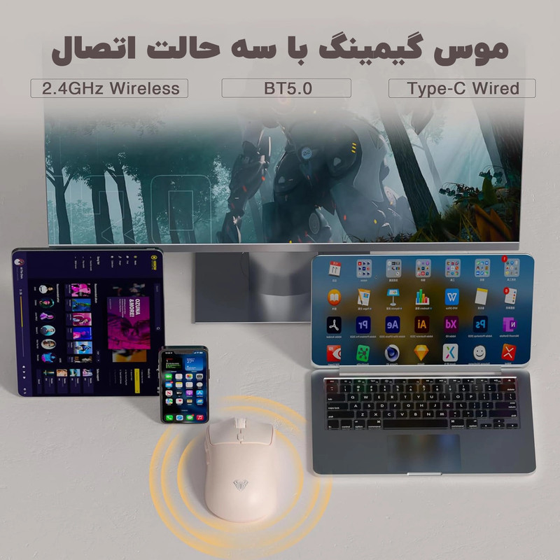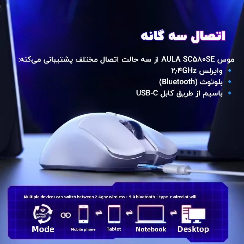 موس گیمینگ بی سیم AULA SC580SE سه حالته بوده و امکان اتصال با سیم (کابل USB-C)، بی سیم ۲.۴ گیگاهرتز و بلوتوث را دارد. این ویژگی به کاربر اجازه می دهد تا موس را روی چند دستگاه مختلف متصل کند؛ برای مثال می توان موس را به لپ تاپ و تبلت به صورت همزمان جفت کرد. تعویض بین حالات اتصال با یک کلید کشویی در زیر موس انجام میشود، همچنین وضعیت BT (بلوتوث)، OF (خاموش) و 2.4G (وایرلس ۲.۴ گیگاهرتز) قابل تغییر است.