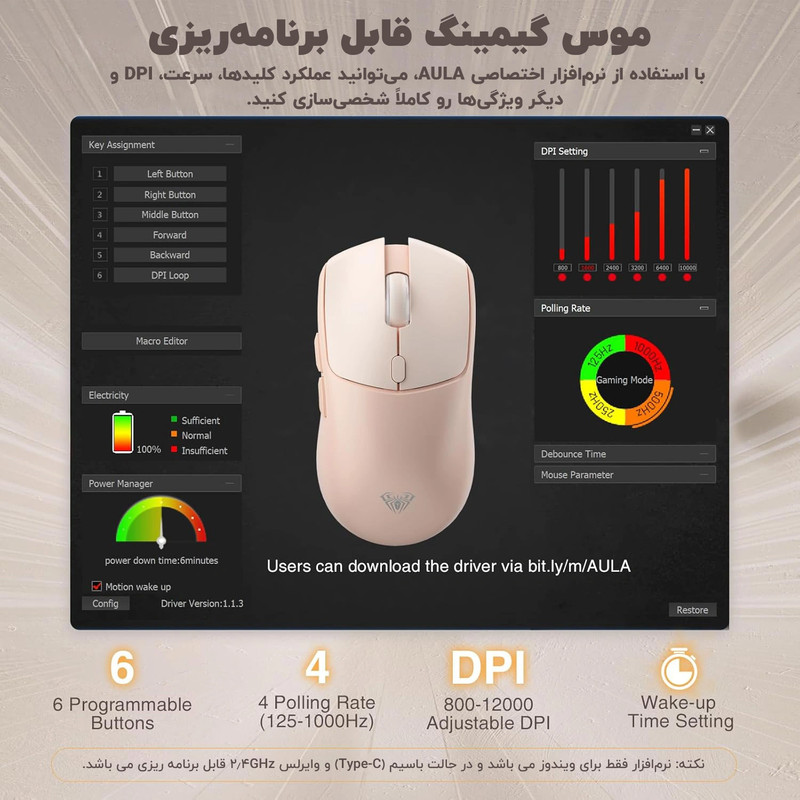 در کل این محصول با ترکیب امکانات گیمینگ مانند حساسیت بالا و پاسخ دهی سریع، و ویژگی های کاربردی مانند اتصال چندگانه و عمر باتری طولانی، گزینه مناسب برای گیمرها و کاربران حرفه ای یا نیمه حرفه ای محسوب می شود . نرم افزار اختصاصی AULA برای ویندوز از طریق وب سایت رسمی قابل دانلود بوده و امکان تنظیم dpi، ایجاد پروفایل های ماکرو و کنترل کامل کلیدها را فراهم می کند.