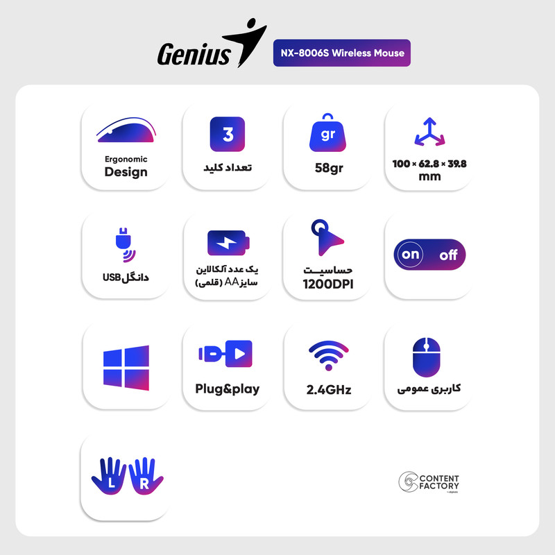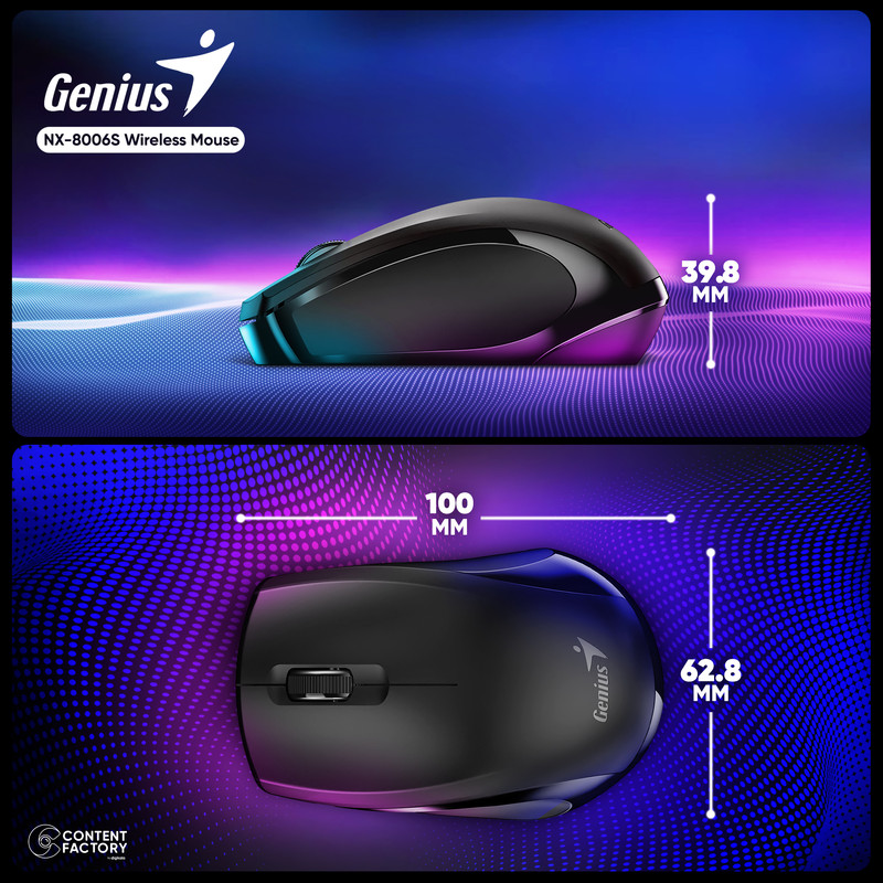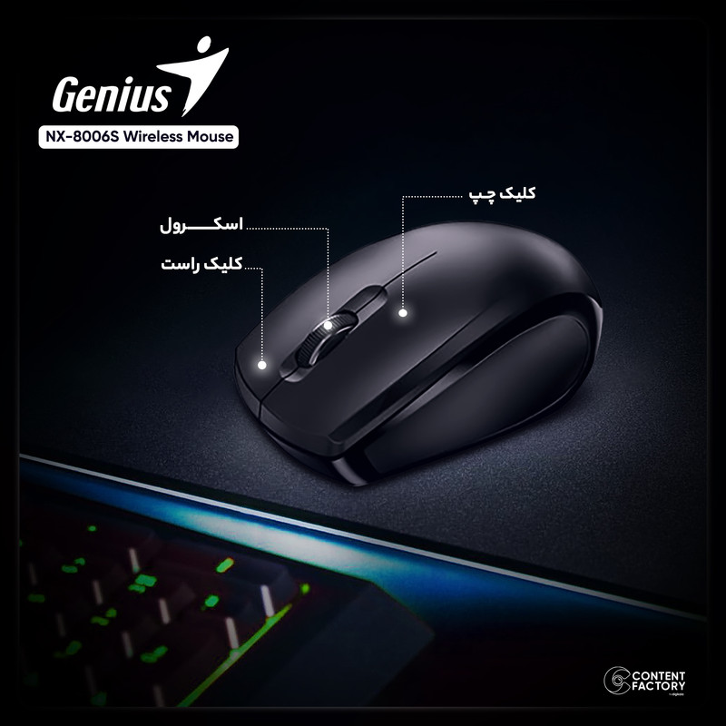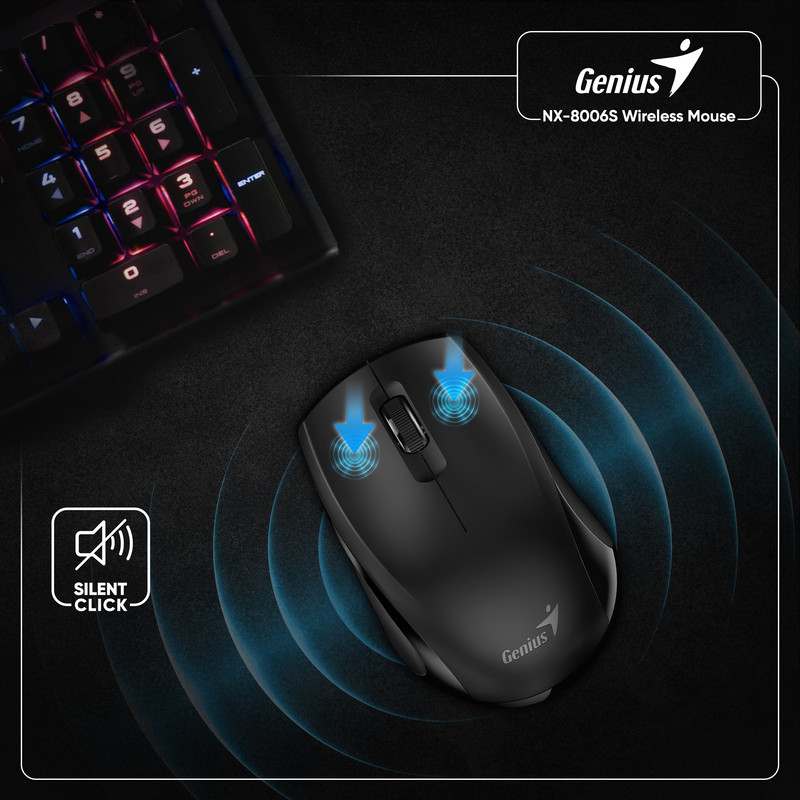 نسل جدیدی از ماوس ها وجود دارد که به آن ها ماوس های سایلنت گفته میشود. ماوس سایلنت همان طور که از اسم آن هم مشخص است ماوسی است که کلیک دکمههای آن صدای بسیار کمی را ایجاد میکند.این ماوسها مانند دیگر انواع ماوس ها کار میکنند و مکانیزم کلیک آنها، کاربری آن ها را از ماوسهای دیگر متمایز نمیکند. البته به دلیل تغییرات ایجاد شده در سیستم کلیک این دسته از ماوسها، کلیک آنها نرمتر است و مقدار جابهجایی دکمههای آنها هم طبیعتا بسیار کمتر از ماوسهای دیگر است و به همین دلیل برای گیمینگ مناسب نیستند، اما برای استفاده در محیطهای شلوغ اداری که تعداد زیادی از افراد در آن ها مشغول به کار هستند، حذف این صداهای اضافی میتواند به بسیاری از افراد در حفظ تمرکز خود در حین کار کمک کند. موس بی سیم جنیوس مدل Genius NX-8006S Wireless Mouse یکی از ماوسهای با کیفیت و سایلنت شرکت جنیوس است. ماوس جنیوس Genius NX-8006S دارای سه کلید برای اعمال دستورات کاربران در انجام کارهای کامپیوتری است. ماوس بی سیم جنیوس مدل NX-8006S دارای ابعاد ابعاد 10×5.8×3.9 سانتی متر و وزنی معادل 58 گرم دارد. برند جنیوس این مدل ماوس را در سه رنگ سفید، قرمز و مشکی تولید کرده است. این ماوس با طراحی آرگونومی خود باعث میشود که در هنگام کار با این ماوس احساس خستگی نکنید. علاوه بر این، این ماوس به گونهایی طراحی شده است که قابلیت استفاده با هر دو دست را دارد. حسگر موس بی سیم جنیوس مدل NX-8006S از نوع اپتیکال بوده و به یاری آن میتوان روی انواع سطوح از این ماوس استفاده کنید. محدوده دقت موس بی سیم جنیوس مدل NX-8006S از 800 تا 1200 نقطه بر اینچ است.
