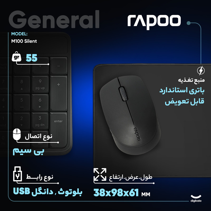 امروزه شرکتهای زیادی با تولید انواع و اقسام مختلف محصولات در تلاشاند تا جای خود را در بازار پرطرفدار محصولات الکترونیکی بیابند. شرکت رپو یکی از این تولیدکنندههاست که با طراحی و تولید محصولات باکیفیت و ارزان توانسته است سهم بزرگی از بازار کشورهای شرق آسیا، آمریکای شمالی و جنوبی و اروپای شرقی را به خود اختصاص دهد. محصولات این شرکت امروزه در خاورمیانه نیز به شهرت و محبوبیت بالایی رسیدهاند. شرکت رپو اولویت قرار دادن «فناوری سبک زندگی» را بهعنوان هدف خود در نظر گرفته است و در تلاش است شکل زندگی را با استفاده از فناوریهای بهروز ارتقا ببخشد. تولیدات این شرکت را میتوان به محصولات الکترونیکی خلاصه کرد که با طراحی خلاقانه خود، چند کاربرد را باهم ترکیب کردهاند. این شرکت در سالهای اخیر توانسته است با مشارکت با فروشندگان محلی بازار خوبی را برای خود دستوپا کند. ماوس بلوتوثی مدل m100silent به عنوان نمونه ای از این فناوری در خدمت سبک زندگی با طراحی چشمگیر و در عین حال ارگونامیک و راحت کلید های بی صدا و قابلیت استفاده همزمان با دو دستگاه حتی با سیستم عامل های متفاوت مثال زدنی است . به همراه این موس بلوتوثی یک دانگل وایرلس هم ارائه شده که می توانید از طریق دانگل به کامپیوتر شخصی یا لپ تاپ متصل شده و از طریق بلوتوث هم به دو دستگاه لپ تاپ ،گوشی ،تبلت یا سورفیس از طریق دو فرکانس مختلف بلوتوث متصل شده و بین دو بلوتوث با فشردن کلید زیر موس براحتی سوئیچ کنید و مجموعا به سه دستگاه مختلف متصل باشید (با خاموش کردن بلوتوث بصورت خودکار به سیستمی که دانگل متصل است وصل می شوید)