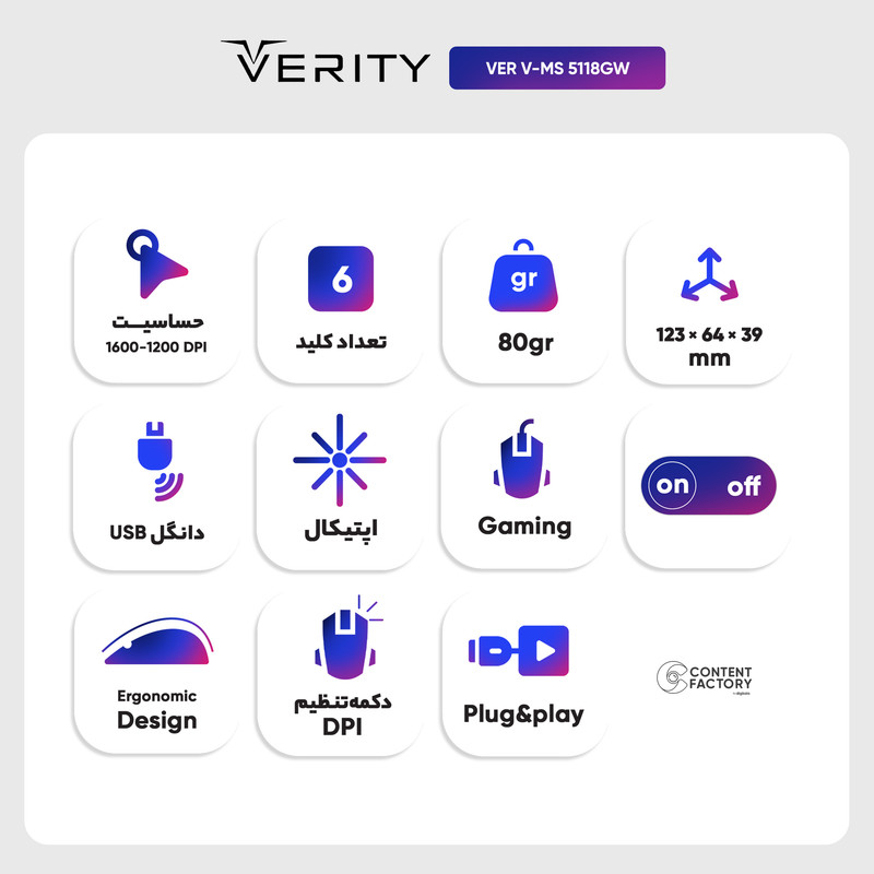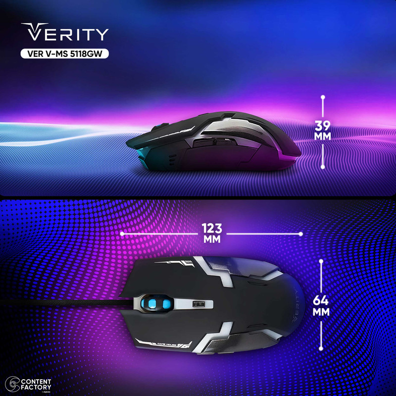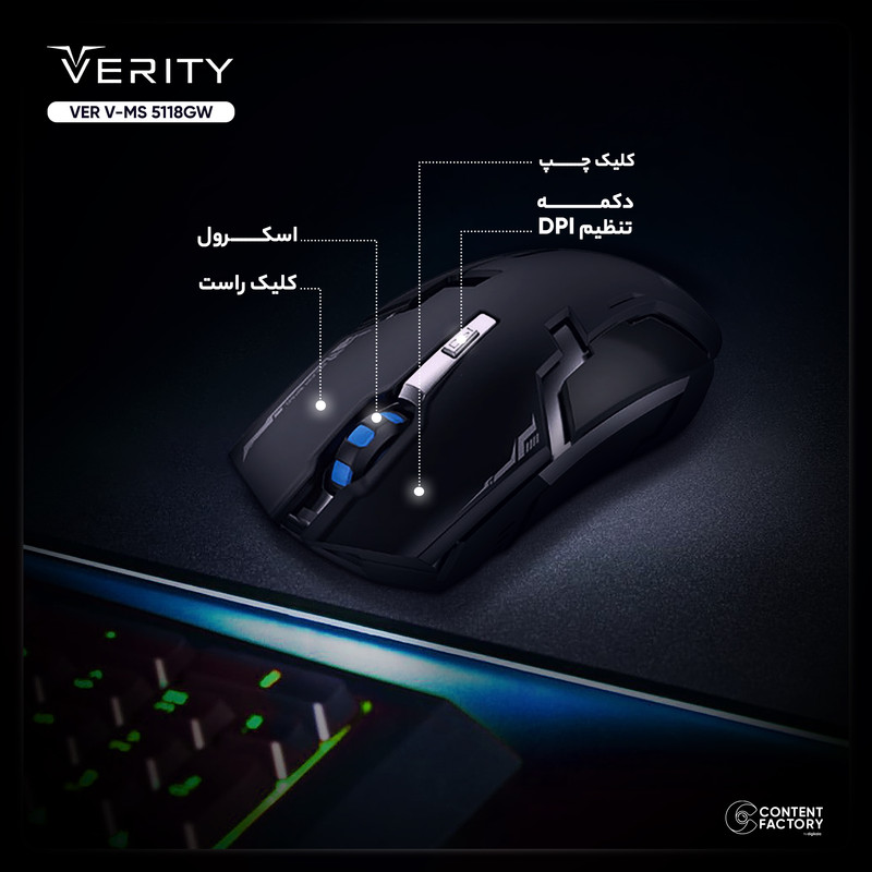 ماوس بیسیم وریتی مدل V-MS5118GW یکی از جدیدترین محصولات شرکت وریتی است این شرکت به صورت تخصصی در تولید محصولات گیمینگ فعالیت میکند و ماوسهای گیمینگ با تاخیر پایین، اتصال پایدار و کیفیت ساخت بالا را به مشتریان ارائه میدهد. ماوس وریتی مدل V-MS5118GW یک ماوس بیسیم با وزن 80 گرم است که برای استفاده در بازی طراحی شده که با داشتن حسگر اپتیکال با دقت 800 تا 1600 امکان استفاده بر سطوح مختلف مانند چوبی، سنگی و شیشهای را فراهم میکنند. برای شارژ ماوس بیسیم وریتی، میتوان از دو روش استفاده کرد. اولین روش استفاده از آداپتور است. آداپتوری که به همراه ماوس ارائه میشود، امکان شارژ سریع و آسان را فراهم میکند. روش دیگر استفاده از کابل USB به کامپیوتر است. این روش همچنین به کاربر امکان میدهد تا ماوس را در حالت شارژ به کار استفاده کند. این ماوس بیسیم با طراحی ارگونومیک و اندازه بزرگ، به خوبی در دست قرار میگیرد و استفاده راحتی برای افرادی با دست بزرگ فراهم میکند. این ماوس با دارا بودن دکمه DPI قابل تنظیم، به کاربر امکان میدهد تا دقت مورد نیاز خود را برای هر لحظه از بازی یا کار تنظیم کند. ماوس بیسیم مخصوص بازی وریتی مدل V-MS5118GW دارای نور RGB قابل تنظیم است. این ویژگی به کاربر اجازه میدهد تا رنگ نور ماوس را به دلخواه خود تنظیم کرده و با سلیقه شخصی خود هماهنگ کند.