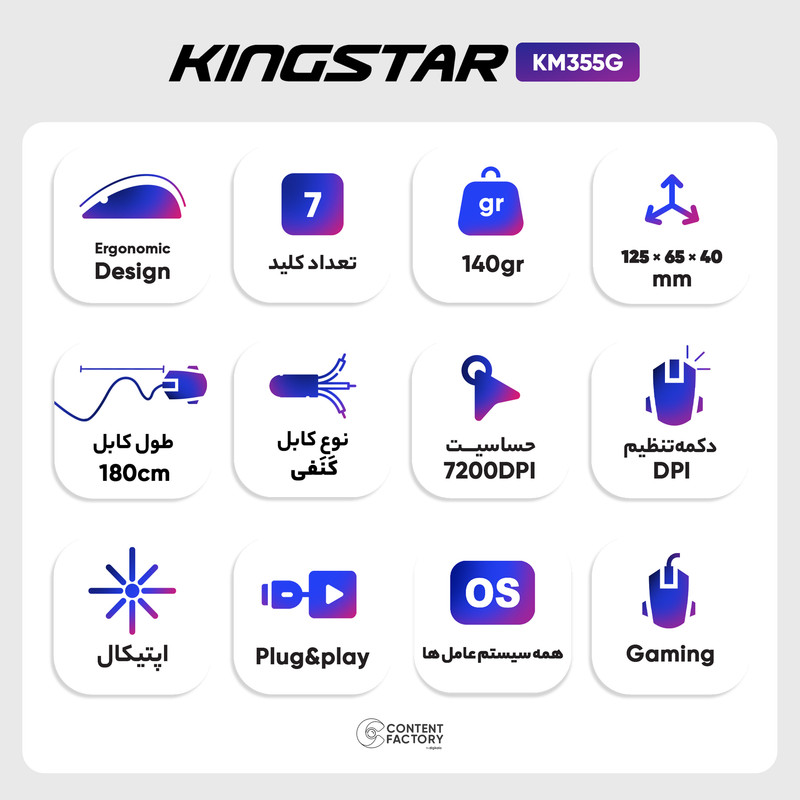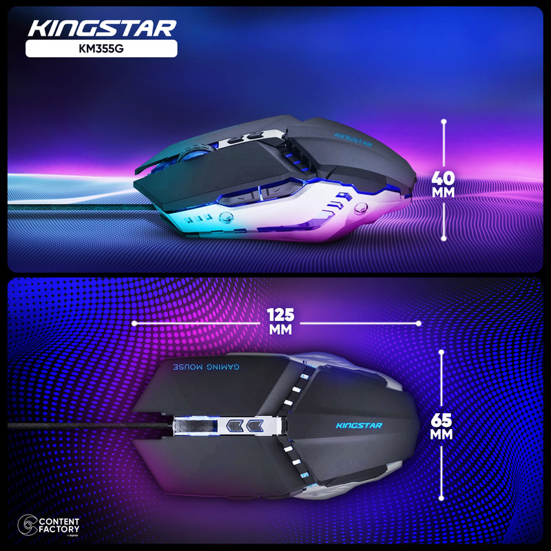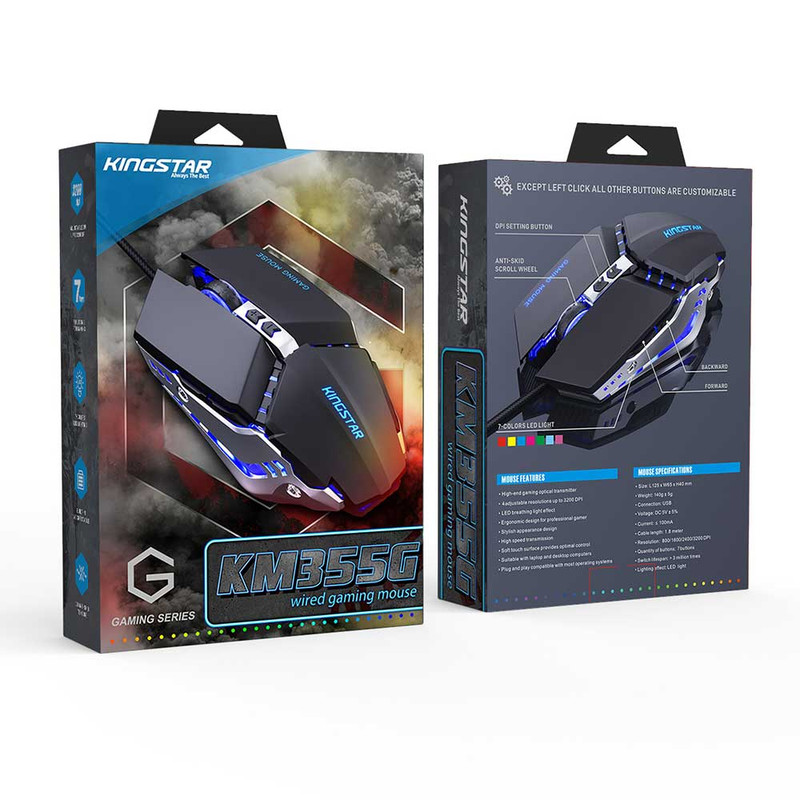 ماوس گیمینگ سیمدار مدل KM355G کینگ استار، از جمله ماوسهای معروف و پر طرفدار در دنیای کامپیوتر بهحساب میآید. این ماوس، از طریق کابل و پورت USB به کامپیوتر متصل میشود. طول کابل این ماوس 1.8 متر است و جنس رویه کابل آن از کنف ساخته شده است. طراحی ارگونومیکی ماوس مذکور، باعث میشود کاربر پس از استفاده مداوم حس خستگی نکند. ضربهپذیری کلیدهای این محصول برابر با 3 میلیون بار است.