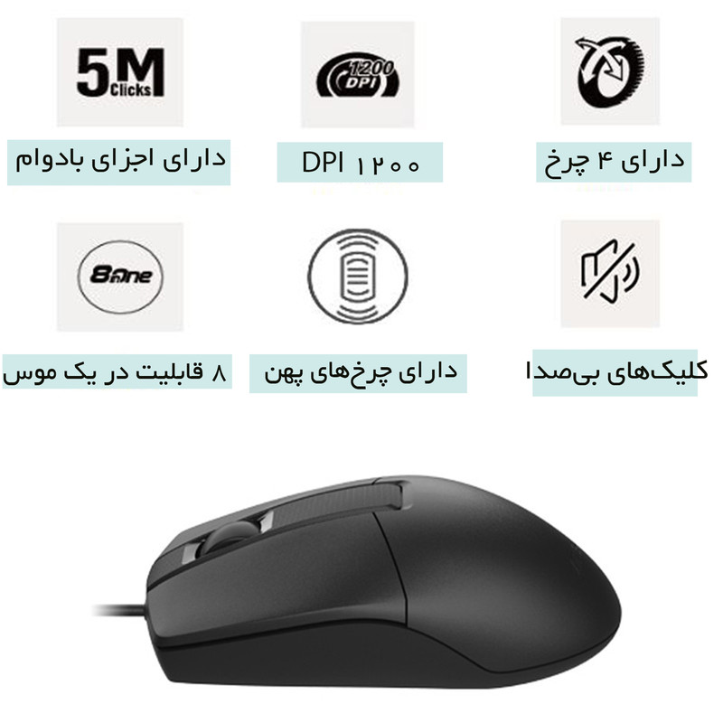 یک ماوس تمام عیار با دقت و حساسیت بسیار بالا از برند جهانی ای فورتک . این ماوس با کلیک های کاملا بیصدا با دقت تا 1200 dpi سهولت کار شما را بیش از پیش میکند . این ماوس با طراحی فوق العاده با گودی دست شما طبیق دارد تا با کار زیاد با ماوس احساس خستگی نکنید