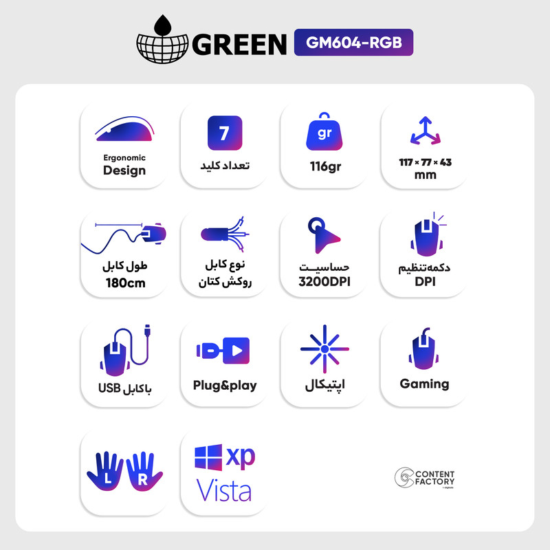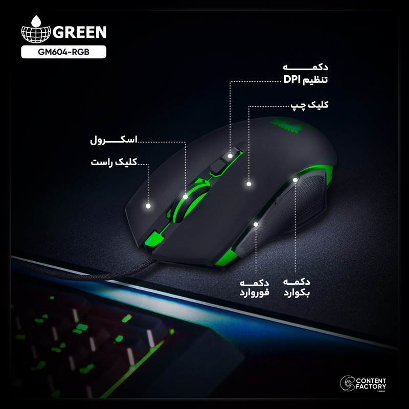 برند گرین یکی از برندهای معتبر و محبوب در زمینه تولید لوازم جانبی کامپیوتر و گیمینگ است. این برند با تمرکز بر کیفیت و نوآوری، محصولات متنوعی را در اختیار مشتریان خود قرار میدهد. همچنین با ارائه محصولات با قیمت مناسب و کیفیت بالا، توانسته است جایگاه خود را در بازار لوازم جانبی کامپیوتر و گیمینگ حفظ کند. این ماوس با سیمی به طول 180 سانتیمتر با روکش کتان بافته شده که در جهت افزایش دوام اتصالات است با وزن 116 گرم به کامپوتر متصل میشود. ماوس گرین مدل GM604-RGB با حسگر اپتیکال با قدت 1600 تا 3200، مناسب برای استفاده در سطوح چوبی، سنگی و شیشهای است و با حرکتی نرم و بیصدا، تجربه بازی فوق العادهای را برای کاربران ارائه میدهد. این ماوس مجهز به ۷ کلید با قابلیتهای backward، Forward مناسب برای استفاده با هر دو دست است. برای تنظیم نور RGB این ماوس، ابتدا نرمافزار مربوطه را نصب کنید. با استفاده از این نرم افزار، میتوانید رنگ، روشنایی و الگوهای نور را به دلخواه تنظیم کنید. همچنین میتوانید از نرمافزار مربوطه استفاده کرده و نور را بهطور کامل خاموش کنید. با قابلیتهایی از جمله حساسیت قابل تنظیم، سرعت و دقت بالا، برای انواع بازیها از جمله بازیهای اکشن، استراتژیک و ورزشی مناسب است. ماوس گرین با طراحی ارگونومیک از خستگی دست جلوگیری کرده و همچنین قابلیت انتخاب حساسیت مختلف را دارد. این ماوس از وزن مناسب و قابلیت تنظیم DPI برخوردار است. برای تنظیم DPI، ماوس را به سیستم وصل کنید. سپس با استفاده از نرمافزار مخصوص ماوس، بازیکنان میتوانند به راحتی DPI ماوس را تنظیم کرده و حساسیت مورد نظر خود را انتخاب کنند.
