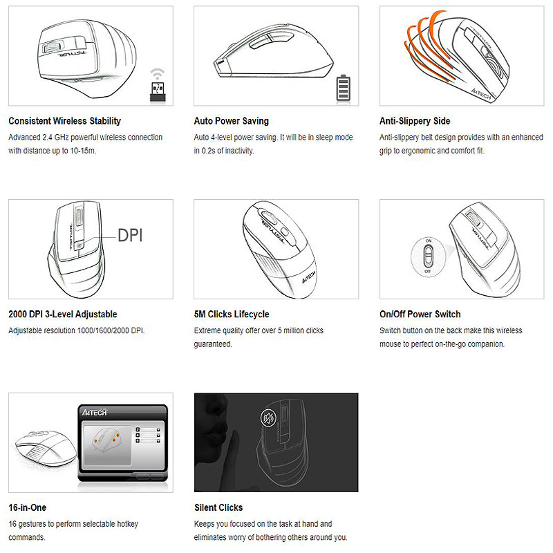 این ماوس توسط باتری آلکالاین AA سایز قلمی تغذیه میشود این امکان را دارد که انرژی را تا مدت زمان طولانی حفظ و ذخیره کند؛ به همین علت، نیازی نیست که دغدغهای بابت شارژ یا تعویض باتری آن داشته باشید. وزن این ماوس 100 گرم و توسط دانگل USB به سیستم متصل شده و برد آن تا 15 متر کاربرد دارد. حسگر اپتیکال با دقت 1000 تا 2000 دارد. طراحی ارگونومیک ماوس بیسیم باعث میشود تا مدت زمان طولانی بدون خستگی دست از آن استفاده کرد. این ماوس دارای 6 کلید با قابیلت بدون صدا است که گیمرها به راحتی میتواند بدون مختل شدن تمرکز از آن استفاده کنند. همچنین این ماوس با داشتن تعداد کلید مناسب، دقت سنسور بالا و طول عمر بالای کلیدها انتخاب مناسبی برای کاربران است.