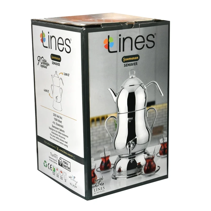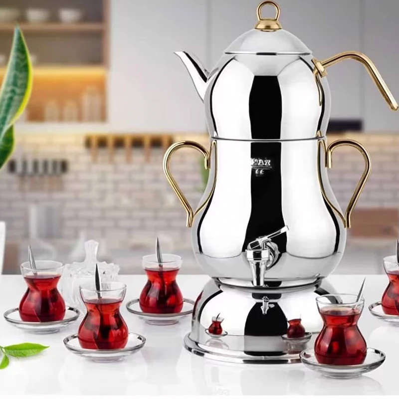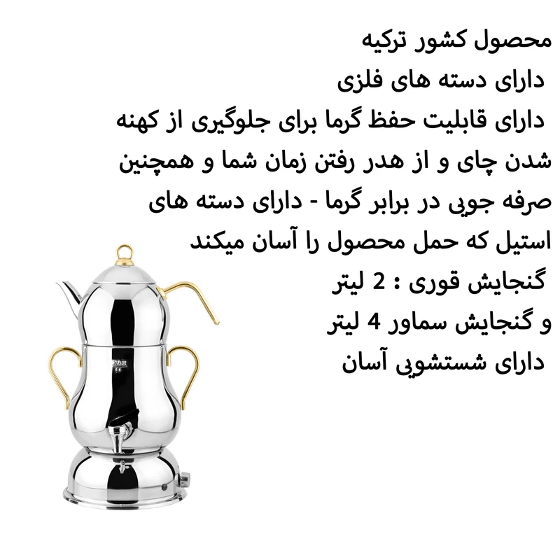 محصول کشور ترکیه - دارای دسته های فلزی - دارای قابلیت حفظ گرما برای جلوگیری از کهنه شدن چای و از هدر رفتن زمان شما و همچنین صرفه جویی در برابر گرما - دارای دسته های استیل که حمل محصول را آسان میکند - گنجایش قوری : ۲ لیتر و گنجایش سماور ۴ لیتر - دارای شستشویی آسان