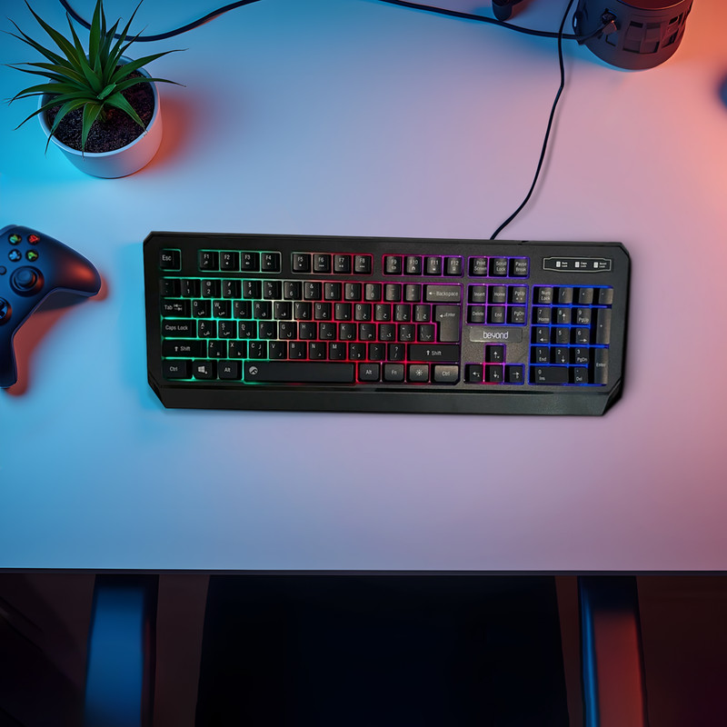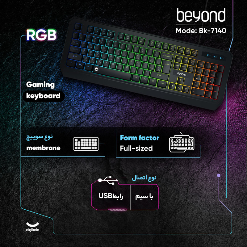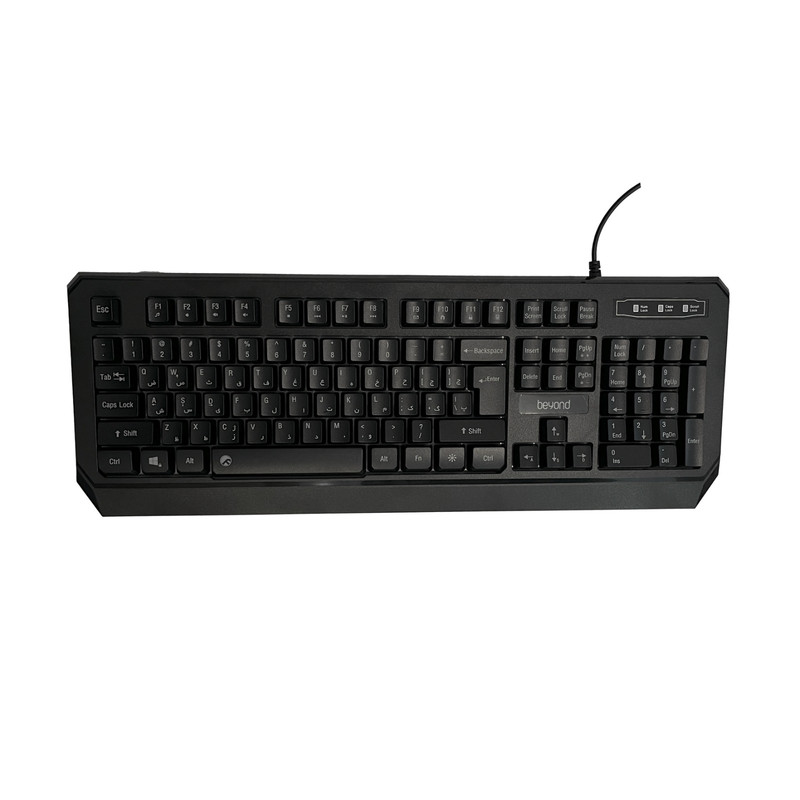 کیبورد بیاند مدل BK‑7140، یک صفحهکلید فولسایز مخصوص استفادههای اداری و خانگی است که با استفاده از سوییچهای ممبران عملکردی نرم و بیصدا ارائه میدهد. ابعاد آن ۴۶۵ در ۱۷۱ در ۳۵ میلیمتر و وزن ۴۰۰ گرم است. بدنه کیبورد از پلاستیک ساخته شده و طراحی ساده و ارگونومیک آن، راحتی تایپ را تضمین میکند. حروف فارسی حکشده، تجربه تایپ دقیق را برای کاربران فراهم میکند. این کیبورد دارای ۱۰۴ کلید اصلی به همراه ۱۲ کلید میانبر است که دسترسی سریع به عملکردهای مهم مانند کنترل صوت و دستورات مدیا را ممکن میسازد. اتصال کیبورد از طریق رابط USB و به روش Plug & Play انجام میشود، بدین ترتیب نصب آن بدون دردسر صورت میگیرد. همچنین پایههای ضد لغزش، ثبات کیبورد را در طول استفاده تضمین میکنند. این محصول با تمامی سیستمعاملهای رایج از جمله ویندوز، اندروید و iOS سازگاری دارد و منبع تغذیه آن از طریق USB تامین میشود. طول کابل این کیبورد ۱۴۰ سانتیمتر است.