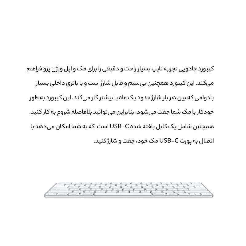 صفحه کلید اپل مدل Magic Keyboard MK2A3LL/A US-English 2021 تجربه تایپ بسیار راحت و دقیقی را ارائه می دهد. همچنین بیسیم و قابل شارژ است و باتری داخلی فوقالعادهای با دوام دارد که تا حدود یک ماه انرژی صفحهکلید شما را تامین میکند. به طور خودکار با دستگاه Mac شما متصل میشود، بنابراین میتوانید فوراً به کار خود برسید. همجنین شامل یک کابل USB-C به لایتنینگ است که به شما این امکان را می دهد با اتصال به پورت USB-C در مک خود کیبورد همگام سازی و شارژ کنید.