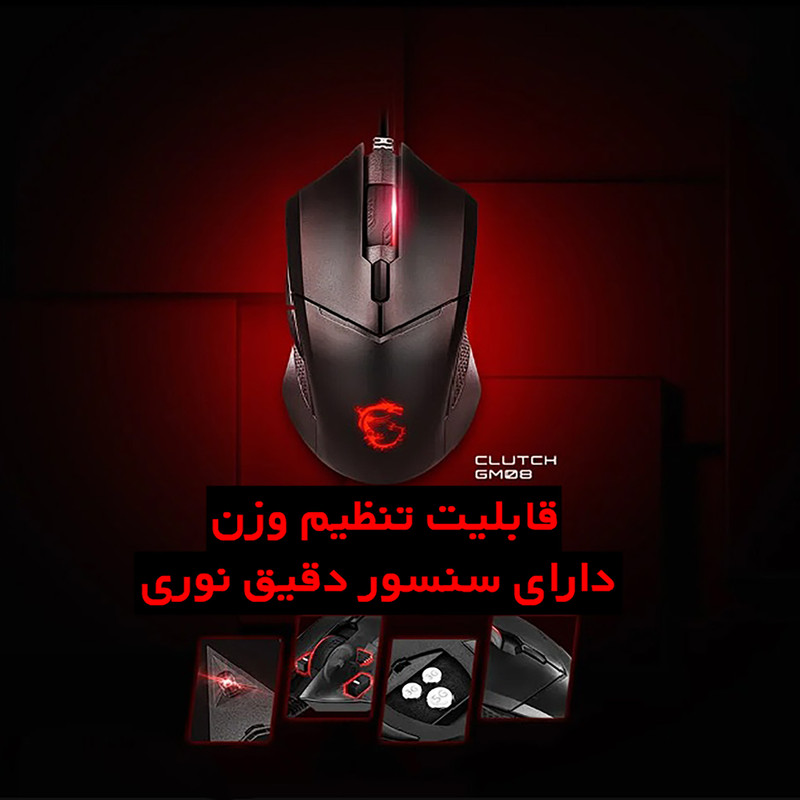 ماوس GM08 یک ماوس گیمینگ سبک وزن با طراحی متقارن است. سیستم تنظیم وزن، این ماوس را بر اساس وزن دلخواه، سبک یا سنگین می کند. تنظیمات بیشتر را میتوان از طریق MSI’s Dragon Center و نرمافزار MSI Center انجام داد.