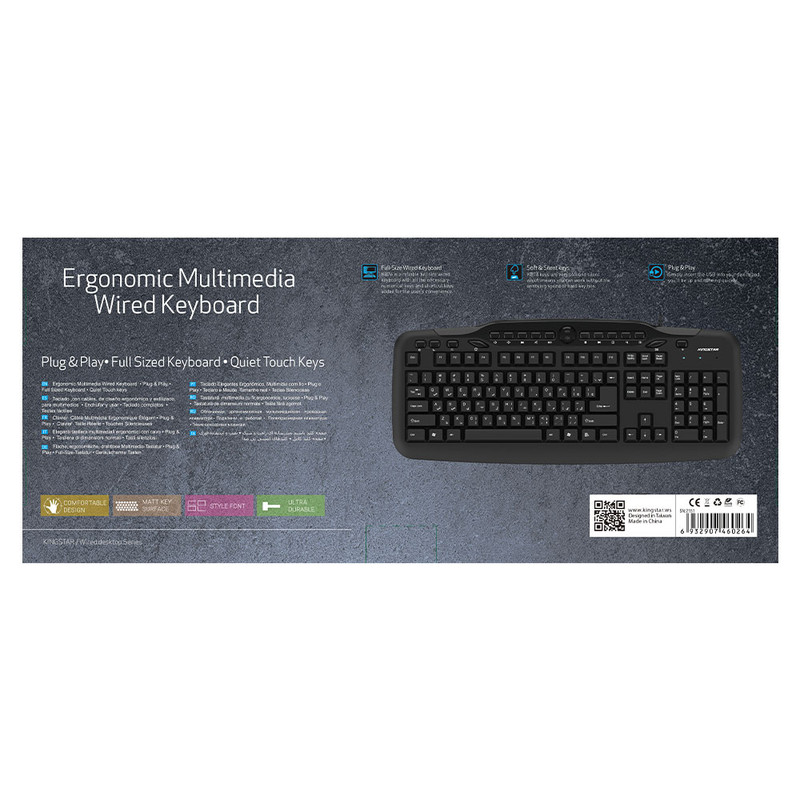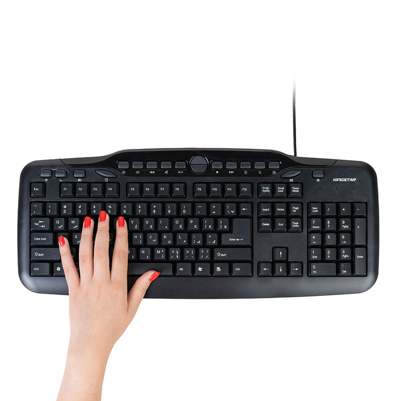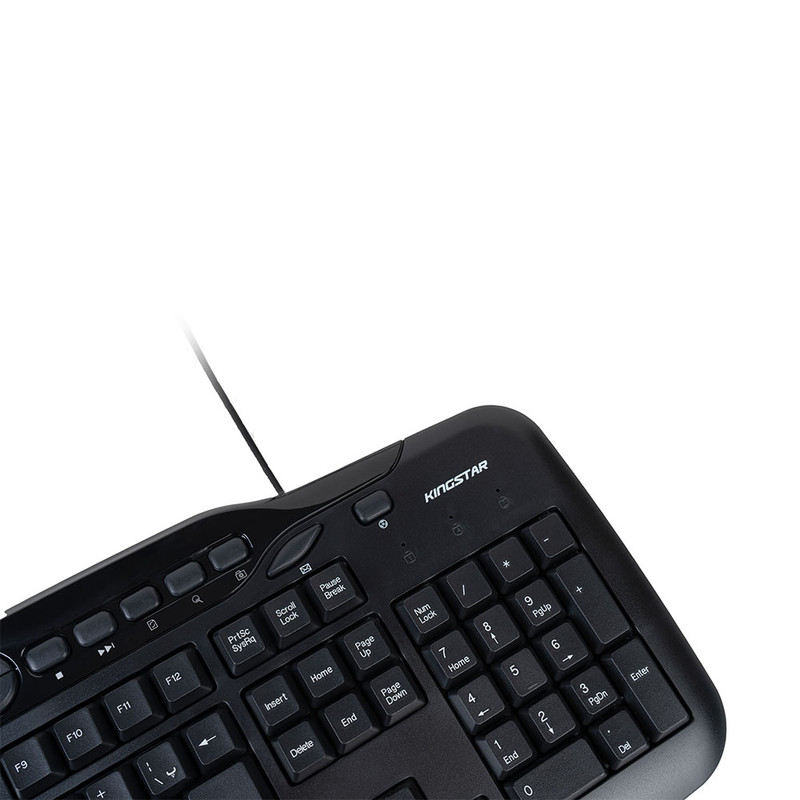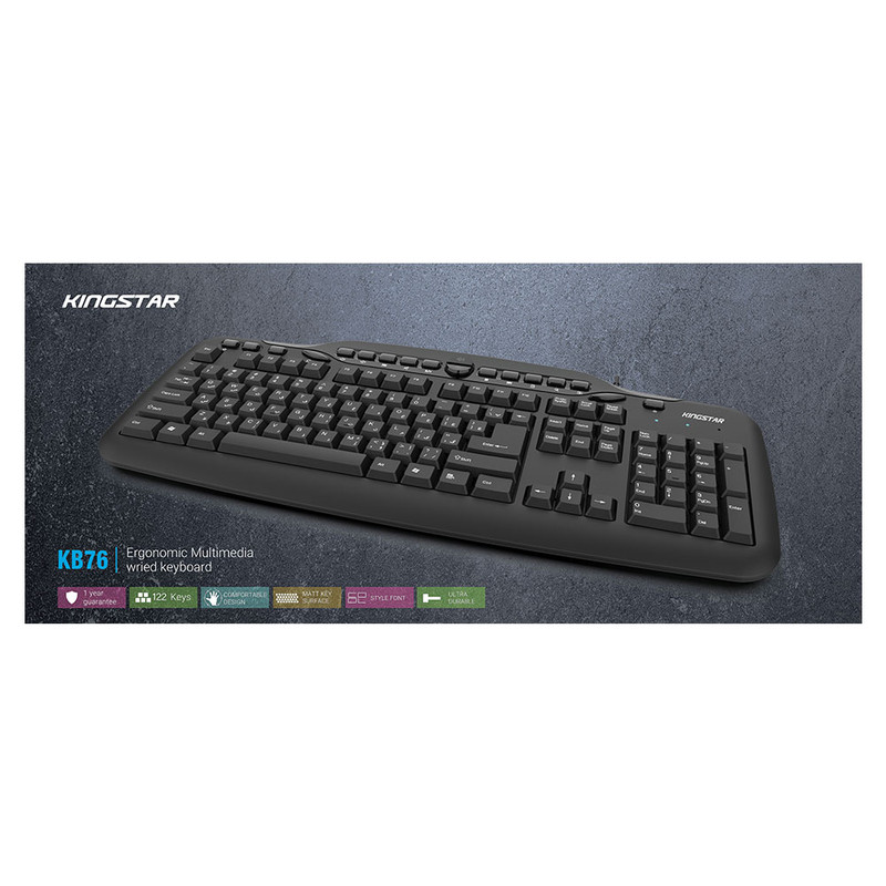کیبورد کینگ استار مدل kb76 از نوع سیم دار میباشد و از طریق درگاه USB به کامپیوتر متصل میشود. این کیبورد دارای 122 کلید برای انجام فعالیتهای کامپیوتری است. همچنین کیبورد kb76 دارای 18 کلید میانبر به منظور انجام سریعتر کارهاست که عبارتند از Search, Dormant, Refresh, Back, Forward, Power, E-mail, Music, Play/Pause, Pre Track, Next Track, Volume +-, Web Home, My Computer. کیبورد کینگ استار مدل kb76 برای استفادههای روزمره مناسب میباشد. از دیگر ویژگیهای این کیبورد محصول کمپانی کینگ استار، طراحی کلیدها به گونهای که امکان تایپ کردن در مدت زمانی طولانی را فراهم می کند، دسترسی راحت به تمامی کلیدهای کاربردی، طراحی نرم و سایلنت کلیدها، با دوام و دارای کلیدهای مات میباشد.