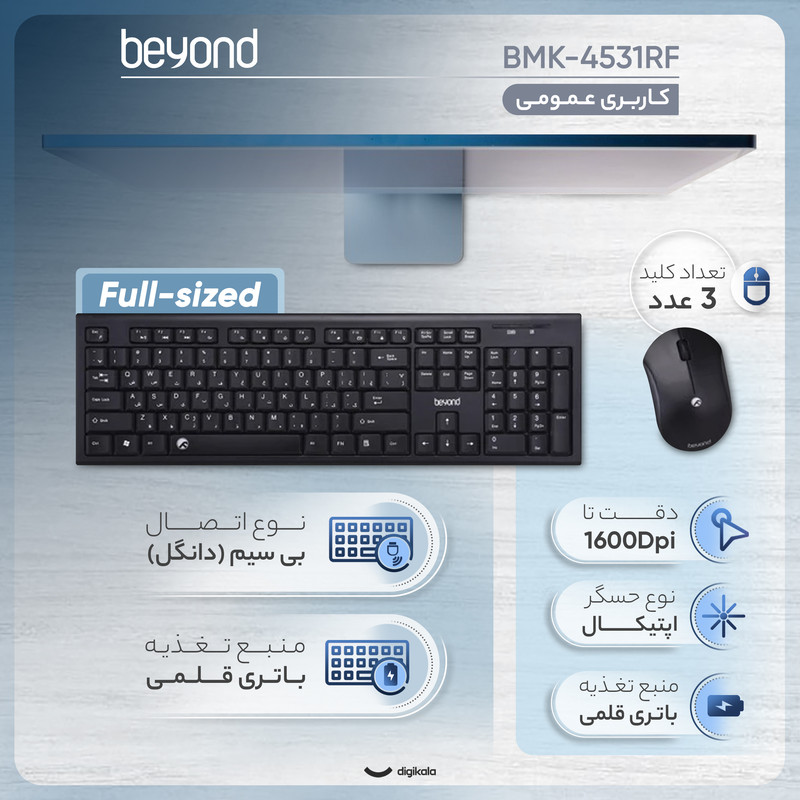 کیبورد و ماوس بیسیم بیاند مدل BMK-4531RF، یک مجموعه کارآمد برای استفاده اداری و خانگی است. این محصول با فرم فولسایز، ۱۰۴ کلید اصلی را ارائه میدهد و با حروف حکشده فارسی، تایپ متنهای فارسی را برای کاربر آسانتر میکند. سوییچهای ممبران در این کیبورد با عمر ضربهپذیری تا هشت میلیون کلیک، صدای کمتری نسبت به کیبوردهای مکانیکال تولید میکنند. پایههای قابل تنظیم و ضدلغزش، امکان تغییر زاویه کیبورد را فراهم کرده و از جابهجایی ناخواسته حین تایپ جلوگیری میکنند. اتصال بیسیم از طریق دانگل USB و فرکانس ۲.۴ گیگاهرتز، بردی در حدود ۱۰ متر را پوشش میدهد و به شما آزادی عمل بیشتری روی میز میدهد.