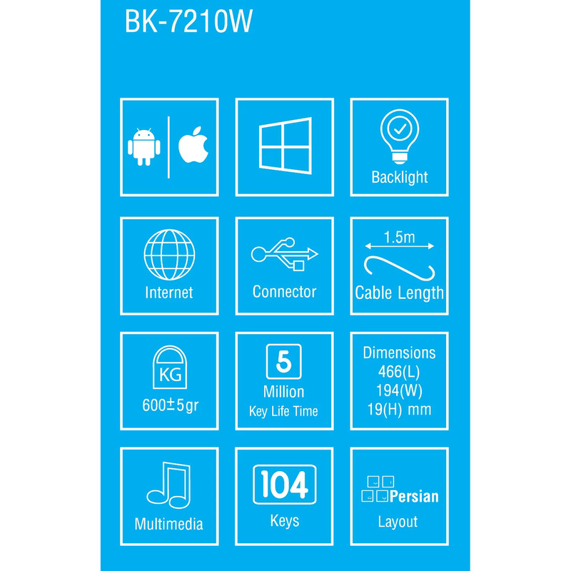 نوع کیبورد (صفحه کلید)اداری / خانگیکاربری کیبوردعمومیابعاد20x190x440 میلیمتروزن600 گرمجنس بدنهپلاستیکرنگمشکی