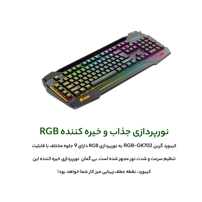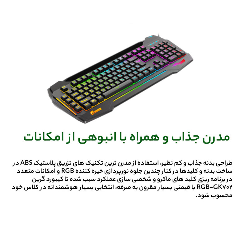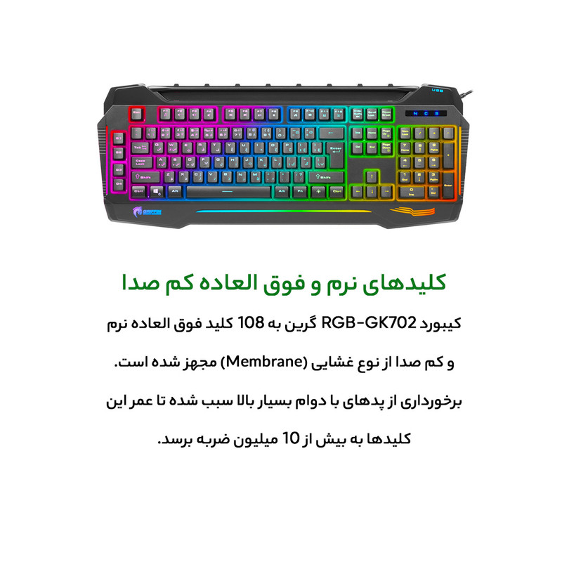 کیبورد مخصوص بازی گرین مدل GK702-RGB با طراحی مدرن و امکانات پیشرفته، تجربهای بینظیر برای گیمرها فراهم میکند. این کیبورد با ۱۰۸ کلید غشایی نرم و کمصدا، عمر مفید بیش از ۱۰ میلیون ضربه را تضمین میکند. همچنین، وجود ۴ کلید ماکرو قابل برنامهریزی (G1 تا G4) امکان ذخیره و اجرای سریع ترکیبهای مختلف را به کاربر میدهد.