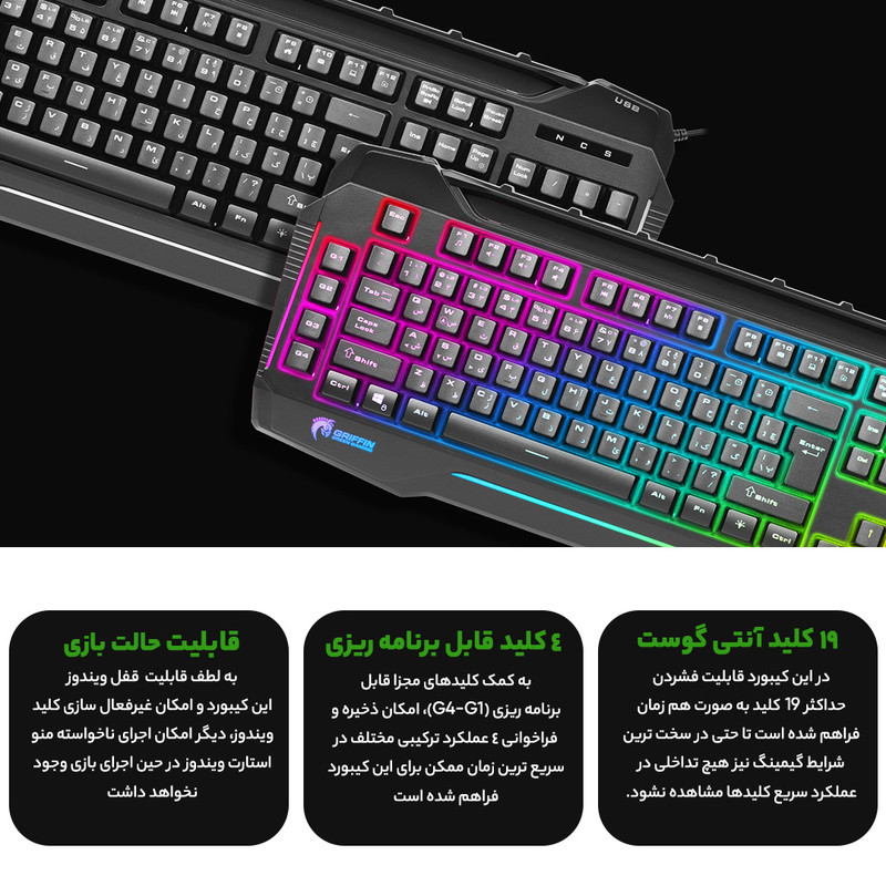 نورپردازی RGB با ۹ جلوه نوری مختلف و قابلیت تنظیم شدت روشنایی، جلوهای خیرهکننده به محیط بازی میبخشد. همچنین، قابلیت Game Mode و Windows Lock از فشردن ناخواسته کلید ویندوز در حین بازی جلوگیری میکند.