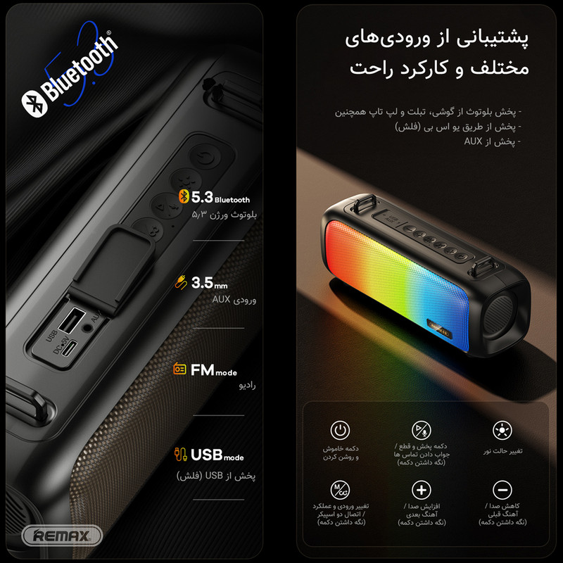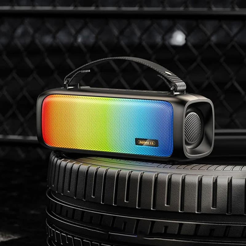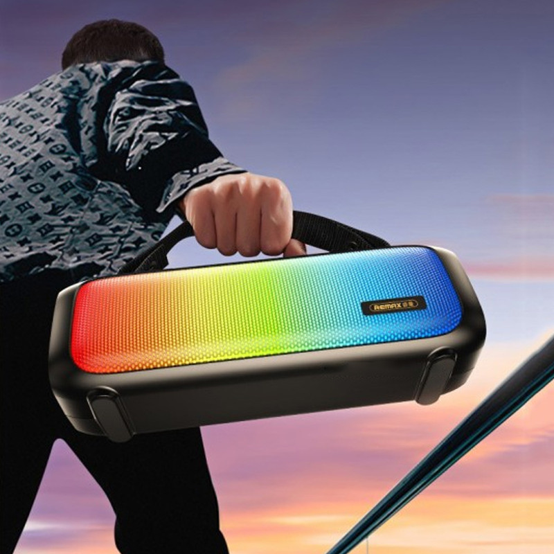 اسپیکر بلوتوث ریمکس ، به کمک دکمههای کنترلی ساده و پشتیبانی از حالتهای بلوتوث ، AUX و پخش از فلش، به راحتی قابل استفاده و اتصال به همه دستگاهها است و میتوانید از هر دستگاهی موسیقی پخش کنید. و با باتری 1500 میلیآمپر ساعتی میتوانید تا 7 ساعت از پخش مداوم لذت ببرید. اسپیکر بلوتوث ریمکس همراه مناسبی برای استفاده در منزل، محل کار یا خارج از منزل برای مهمانی یا فضاهای باز است. این اسپیکر دارای طراحی شیک، ظریف، بادوام و قابل حمل است و دارای دسته ای برای حمل آسان.