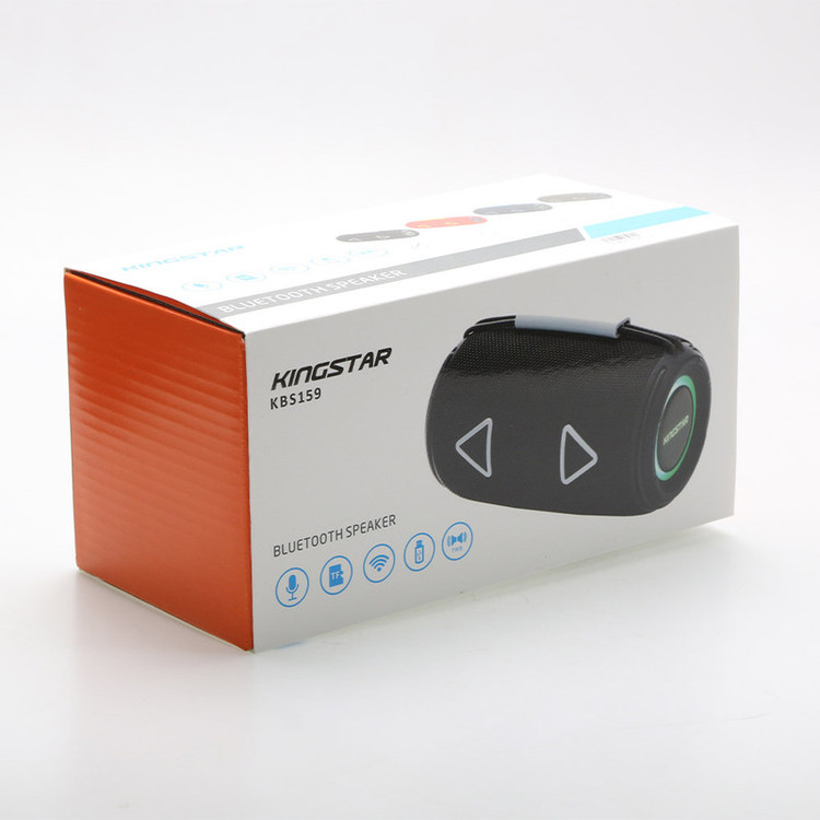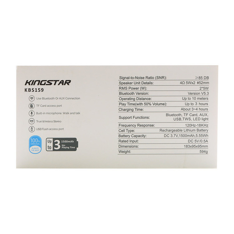 اسپیکر بلوتوثی قابل حمل مدل KBS159 از محصولات جدید کمپانی کینگ استار است. از جمله ویژگیهای بصری این اسپیکر میتوان به بدنه پلاستیکی به ابعاد 183*95*95 میلیمتر و وزن 594 گرمی در کنار نوپردازی RGB آن اشاره کرد. این ابعاد در کنار بند موجود در پشت اسپیکر موجب شده تا این محصول تبدیل به یک کالای قابل حمل و جذاب شود. بر روی این اسپیکر 5 دکمه بزرگ تعبیه شده که شامل دکمه خاموش و روشن، کاهش و افزایش صدا، تغییر مود و PLAY/PUSE و تغییر نورپردازی است. همچنین در قسمت پشتی آن با کنار زدن پوشش لاستیکی، درگاه Type-C جهت شارژ اسپیکر و ورودی های کارت حافظه MicroSD (با فرمت FAT32)، درگاه USB (با فرمت FAT32) و جک 3.5 میلی متری را مشاهده خواهید نمود. KBS159 در 4 رنگ قرمز، مشکی ، خاکستری و سرمه ای، دارای 10 مدل نورپردازی متفاوت نیز میباشد.