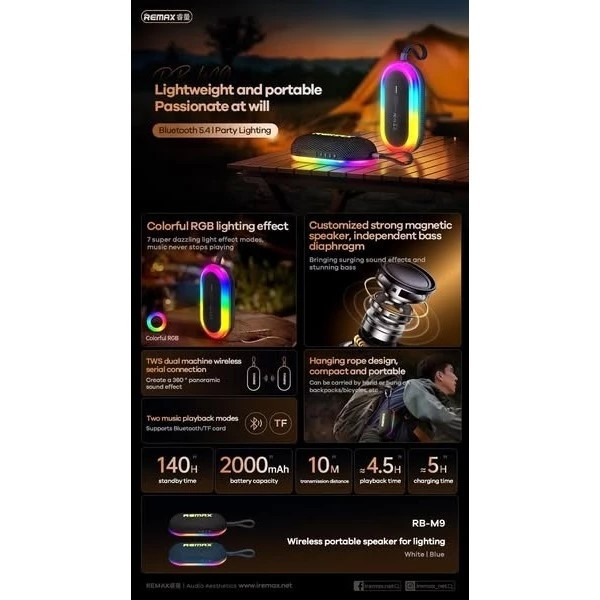 اسپیکر بلوتوث Remax RB-M9 محصولی چشمگیری است که ترکیبی از کیفیت صدای برتر، جلوههای نوری RGB برجسته و طراحی مناسب را ارائه میدهد. با ویژگیهای مدرن، نه تنها یک دستگاه صوتی، بلکه یک محصولی با طراحی ظریف و جمع و جور و وزن سبک است که حمل آن را برای کاربران در هر مکانی آسان میکند. این اسپیکر با یک بند محکم و راحت، نه تنها برای استفاده دستی مناسب است، بلکه میتوان آن را در مکانهای مختلفی مانند کوله پشتی، دوچرخه یا در فضاهای کاری و مطالعه آویزان کرد.مجهز به فناوری صدای پیشرفته با دیافراگم باس مستقل است و صدایی واضح و زنده تولید میکند. به طورخاص، بلندگوی مغناطیسی قدرتمند امکان تولید باس عمیق و محکم را فراهم میکند که برای انواع موسیقی از ملایم تا پرهیجان مناسب است.علاوه بر این، فناوری صوتی بیسیم TWS Dual امکان اتصال همزمان دو بلندگوی RB-M9 را فراهم میکند و یک جلوه صوتی پانورامای 360 درجه ایجاد میکند. این امر نه تنها تجربه گوش دادن به موسیقی را بهبود میبخشد، بلکه حس صدایی شبیه به سینما را نیز به ارمغان میآورد، به خصوص برای تماشای فیلم یا گوش دادن به موسیقی.این انتخاب مناسبی برای کسانی است که عاشق صدای با کیفیت بالا هستند.یکی از نکات برجسته ریمکس RB-M9 جلوه نورپردازی RGB رنگارنگ است. این اسپیکر با 7 حالت نورپردازی مختلف، فضایی پر جنب و جوش و جذاب ایجاد میکند، به خصوص در مهمانیها یا دورهمیها با دوستان. نور درخشان و حرکت روان طیف رنگ به ایجاد فضایی پر جنب و جوش در هر مهمانی کمک میکند.این اسپیکر علاوه بر قابلیت اتصال مموری کارت،به لطف مجهز بودن به فناوری پیشرفته بلوتوث ۵.۴، اتصال بیسیم سریع و پایداری را تضمین میکند و نسبت به نسخههای قبلی انرژی کمتری مصرف میکند. فاصله اتصال تا ۱۰ متر به کاربران این امکان را میدهد که بدون نگرانی از قطع شدن صدا، آزادانه حرکت کنند. دارای باتری با ظرفیت بالای ۲۰۰۰ میلیآمپر ساعت است و این بلندگو امکان پخش مداوم موسیقی تا ۴.۵ ساعت را فراهم میکند.با تمام ویژگیهای برجسته فوق، بلندگوی بلوتوث Remax RB-M9 نه تنها یک تجربه صدای درجه یک را به ارمغان میآورد، بلکه یک فضای سرگرمی منحصر به فرد و رنگارنگ را نیز ایجاد میکند. با قیمت مقرون به صرفه در مقایسه با آنچه ارائه میدهد، RB-M9 قطعاً انتخابی است که برای هر عاشق موسیقی ارزش بررسی دارد.