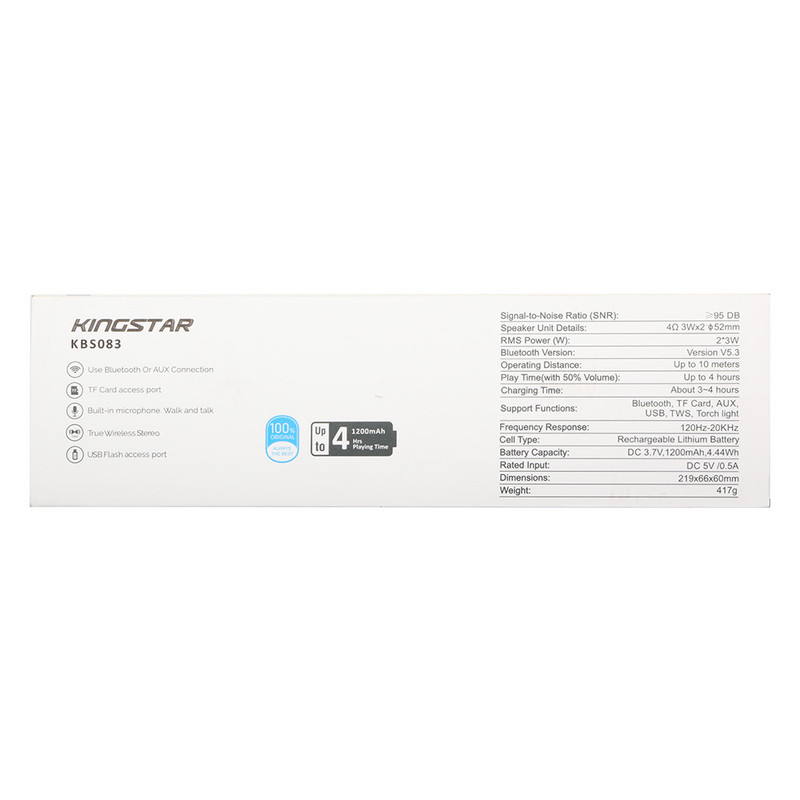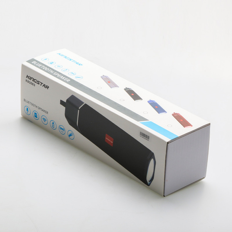 اسپیکر بلوتوثی قابل حمل مدل KBS083 از محصولات جدید کمپانی کینگ استار است. از جمله ویژگیهای بصری این اسپیکر میتوان به بدنه پلاستیکی به ابعاد 219*66*60 میلیمتر و وزن 417 گرمی در کنار چراغ قوه ای که در کنار آن تعبیه اشاره کرد. این ابعاد در کنار بند موجود در روی اسپیکر موجب شده تا این محصول تبدیل به یک کالای قابل حمل و جذاب شود. در قسمت بالایی این اسپیکر 5 دکمه تعبیه شده که شامل دکمه خاموش و روشن، کاهش و افزایش صدا، تغییر مود و چراغ قوه، پاسخ به تماس و PLAY/PUSE است. همچنین در قسمت پشتی آن با کنار زدن پوشش لاستیکی، درگاه microUSB جهت شارژ اسپیکر و ورودی های کارت حافظه MicroSD (با فرمت FAT32)، درگاه USB (با فرمت FAT32) و جک 3.5 میلی متری را مشاهده خواهید نمود. KBS083 در 4 رنگ قرمز، مشکی، خاکستری و سرمه ای، و دارای چراغ قوه نیز میباشد.