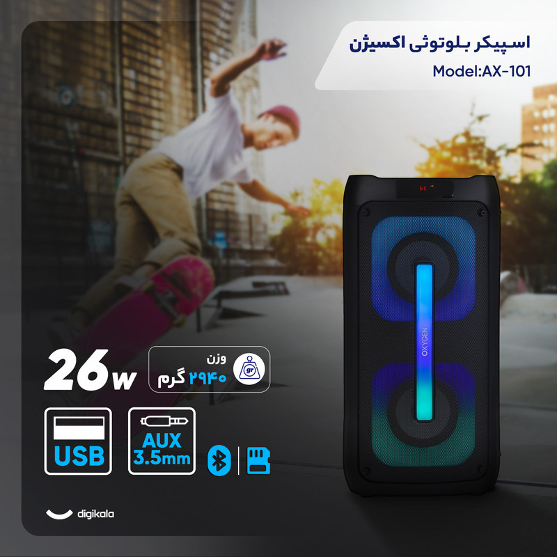 اسپیکر بلوتوثی قابلحمل اکسیژن مدل AX-101 یک دستگاه چندمنظوره و قدرتمند است که برای استفاده در محیطهای داخلی و خارجی طراحی شده است. این اسپیکر با توان خروجی ۲۶ وات و فرکانس پاسخگویی ۸۰ تا ۱۲۰۰ هرتز، کیفیت صدای عالی را برای پخش موسیقی، تماشای فیلم یا استفاده در مراسمها ارائه میدهد. طراحی بدنه از پلاستیک مقاوم، دوام بالایی را تضمین کرده و وزن ۲۹۴۰ گرمی آن به کمک بند حمل، جابهجایی را آسانتر میکند.