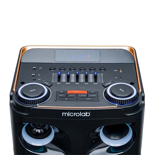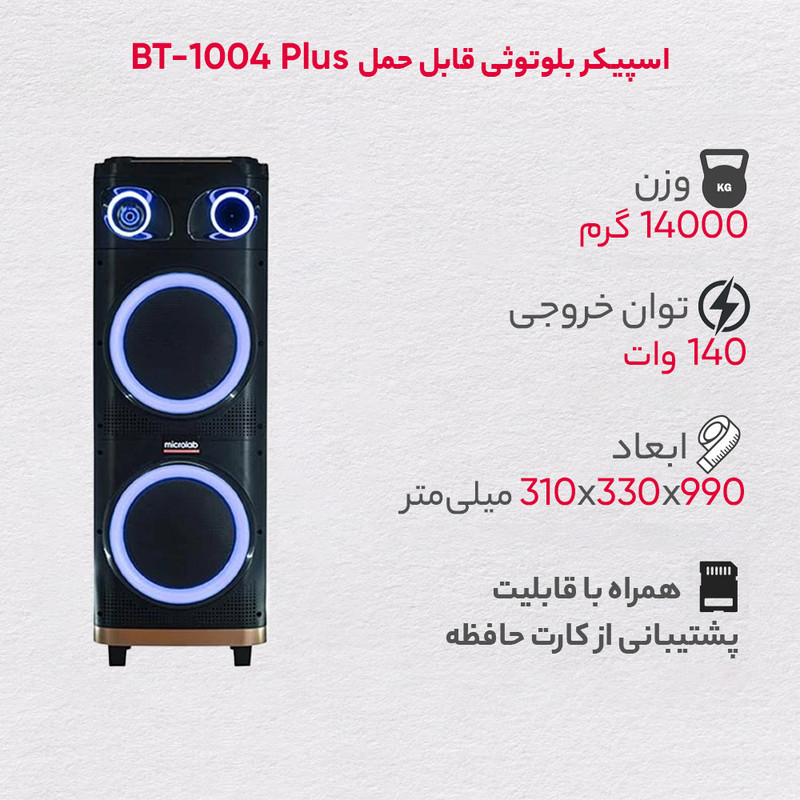 «میکرولب» (microlab) مدل «BT-1400» اسپیکری خوشساخت و حرفهای از این برند است که تمامی امکانات یک اسپیکر را ارائه میکند. این سیستم صوتی از بدنهای از جنس چوب 16 میل ساخته شده است که ارتفاع اسپیکر به 100 سانتیمتر میرسد. در قامت این یونیت، ساب ووفرهای 10 اینچی که با کیفیت مطلوبی ساخته شدهاند، تعبیه شده است. این سیستم صوتی، درگاه USB برای کاربران امکان اتصال فلشمموری را فراهم میکند؛ همچنین میتوانید کارت حافظهی SD خود را به این دستگاه متصل کنید. ، برای آن دو عدد ورودی میکروفون در نظر گرفته شده است تا براحتی میکروفون خود را به دستگاه متصل کنید. این پخشکننده دارای یونیت خوشساخت با دوام و مقاومت بالاست تا کاربرانش را تا مدتزمان بیشتری همراهی کند. طراحی جذاب نمایشگر بزرگ و نودر صورت نیاز، صدای خود را از اسپیکرها پخش کنید. برای این مدل اتصال بیسیم بلوتوث در نظر گرفته شده است. همچنین همراه این اسپیکر، یک عدد میکروفون بیسیم ارائه میشود تا بتوانید یا اسپیکر های دیگر بدون اتصال کابل به این اسپیکر منتقل کنید.