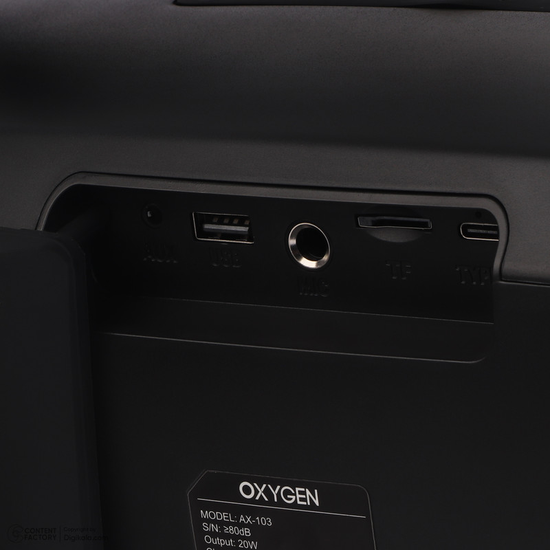 اسپیکر بلوتوثی قابلحمل اکسیژن مدل AX-103 با طراحی کاربردی و امکانات پیشرفته، نیاز کاربران علاقهمند به صدای باکیفیت و قابلیت حمل را تأمین میکند. این محصول با ابعاد ۳۶۰×۱۵۲×۱۹۲ میلیمتر و وزن ۲۳۵۰ گرم، به شکلی طراحی شده که حملونقل آن آسان باشد. ساختار پلاستیکی دستگاه، علاوه بر کاهش وزن، دوام بالایی ارائه و در برابر آسیبهای روزمره مقاومت مطلوبی نشان میدهد.