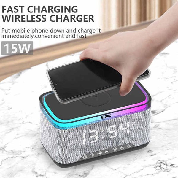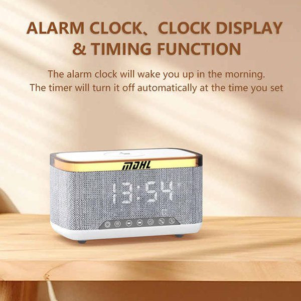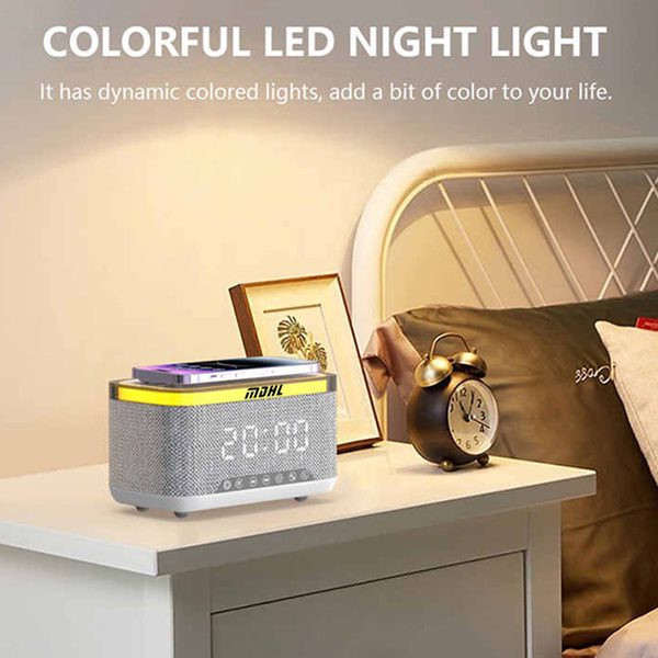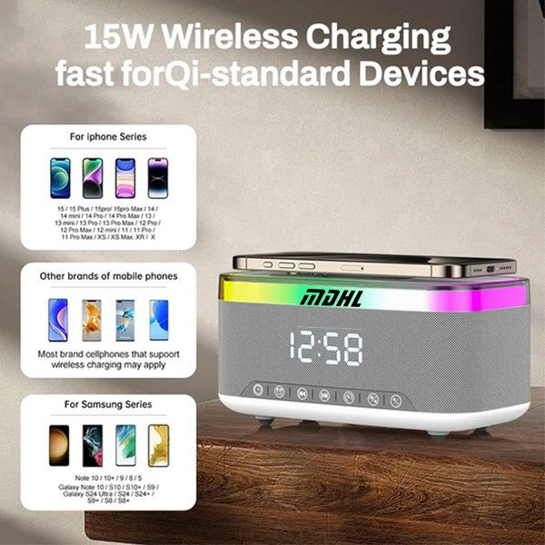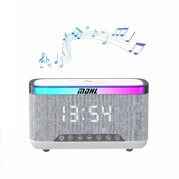 اسپیکر بلوتوثی ، شارژر وایرلس ام دی اچ ال مدل S300 یک محصول چند کاره با قابلیت های متعدد است . این محصول یک چراغ خواب با نور RGB ، یک اسپیکر قوی چند اتصاله ، یک ساعت آلارم دار هوشمند و یک شارژر وایرلس (بی سیم) قدرتمند است .این محصول انواع دستگاه های هوشمند ( تلفن همراه ، ایر پاد ، ساعت هوشمند )را شارژ میکند .لازم به ذکر است که آبتین استور وارد کننده این محصول می باشد . دستگاه را به وسیله کابل شارژر USB که به همراه کالا ارسال میشود را به برق متصل کنید سپس گوشی خود را در جایگاه مخصوص قرار دهید تا به صورت بی سیم شارژ شود . توان خروجی این محصول در حالت ایده آل 10 وات است . تشخیص توان خروجی شارژر به شکل خودکار و متناسب با هر دستگاه است .یک نوار LED در قسمت بالای بدنه کار شده است که باعث شده است شما بتوانید از آن به عنوان چراغ خواب نیز استفاده نمایید ، این نوار دارای 13 مود پخش نور است که با هر بار فشار دادن دکمه میتوانید مود آن را تغییر دهید .این محصول یک اسپیکر قدرتمند نیز است که به وسیله بلوتوث نسل 5 به گوشی شما متصل میشود و حتی میتوانید کارت حافظه TF را نیز به آن متصل کنید و از موزیک همراه با پخش نور زیبای آن لذت ببرید . این محصول هوشمند قابلیت اتصال به رادیو را نیز دارد .اسپیکر بلوتوثی ، شارژر وایرلس ام دی اچ ال مدل MD-S300 یک ساعت رومیزی هوشمند نیز هست که قالبیت تنظیم آلارم را نیز دارد .باطری 1800mAH داخلی این محصول در زمان قطع برق عملکرد ساعت را حفظ و اطلاعات ذخیره شده را پشتیبانی میکند .اگر به دنبال هدیه ای زیبا و جذاب و در عین حال هوشمند برای عزیزان خود به ویژه نوجوانان و جوانان هستید این محصول ویژه شماست . همراه محصول یه چراغ USB نیز ارسال میگردد .