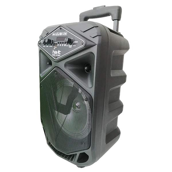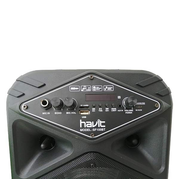 اسپیکر بلوتوث چمدانی هویت مدل HV-SF100BT به صورت بی سیم از طریق بلوتوث به موبایل، تبلت و دستگاه های دیگر متصل شده و دارای یک شیار کارت حافظه جهت اتصال مموری و درگاه 3.5 میلی متری جهت اتصال با کابل AUX می باشد. همچنین این اسپیکر از پورت USB برای اتصال فلش مموری پشتیبانی می کند.