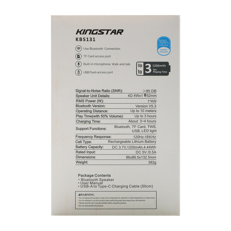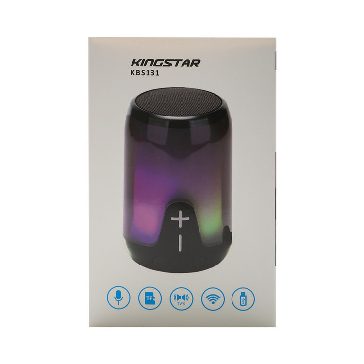 اسپیکر بلوتوثی مدل KBS131 از محصولات جدید کمپانی کینگ استار است. این محصول با ارائه صدایی دلنشین، تجربهی لذت بخشی از شنیدن موسیقی را برای شما به ارمغان میآورد. از جمله از ویژگیهای بصری اسپیکر بلوتوثی مدل KBS131 میتوان به ابعاد مناسب آن که150*100*100 میلیمتر و وزن 382 گرمی اشاره کرد. این ابعاد به همراه دکمههای بزرگ تغییر موسیقی که در مقابل اسپیکر تعبیه شده و بند موجود بر روی اسپیکر موجب شده تا این محصول تبدیل به یک کالای قابل حمل و جذاب برای رفاه کاربران شود. یکی از مواردی که میشود بعنوان نکته اول در رابطه با محصول KBS131 به آن اشاره کرد در خصوص بلوتوث نسخه 5.3 و محدوده عملکرد 10متر بکار رفته در آن است که موجب استفاده از این تکنولوژی در فضای باز شده است. نکته دوم در رابطه با وضوح صدای پویا و شفاف آن در بخش بالایی اسپیکر هنگام پخش موسیقی است که توجه هرکاربری را به خود جلب میکند. این محصول علاوه بر امکان مکالمه قابلیت پشتیبانی از فلش مموری، کارت حافظه با فرمت FAT 32 را نیز داراست.این اسپیکر دارای رقص نور با تنوع بیش از 10 مدل می باشد.علاوه بر موارد گفته شده باید به نکات فنی و تخصصی آن بیشتر توجه داشت. این اسپیکر با 1 درایور 52 میلیمتری، دارای توان خروجی 4 وات است. منبع انرژی این کالا باتری لیتیوم پلیمر داخلی آن با نرخ 3.7 ولت 1200 میلی آمپری است. همچنین میزان حداکثر ورودی و خروجی آن 5V/0.5A است. این محصول با قابلیت پخش موسیقی به اندازه 3 ساعت با میزان صدای 50٪ دارای پاسخ فرکانس 120 هرتز تا 18کیلوهرتز است و با کابل شارژ USB-C در داخل جعبه در طی زمان 3 الی 4 ساعت به طور کامل شارژ می شود.فناوری True Wireless Stereo یا به اختصار TWS یک راه ارتباطی بر پایه فناوری بلوتوث است که امکان برقراری اتصال بدون سیم را فراهم کرده است و از آن طریق میتوان صدایی Stereo با دو کانال صوتی چپ و راست را پخش کرد. به کمک این فناوری نیازی به اتصال سیمی بین کانالهای چپ و راست پخش کننده صوت (مانند ایربادز و اسپیکر) نیست و میتوان آنها را از طریق بلوتوث به یکدیگر متصل نمود. این قابلیت در اسپیکر KBS082 موجب پرطرفدار شدن آن شده است.برای فعالسازی قابلیت TWS به دفترچه راهنما مراجعه شود.