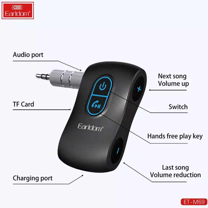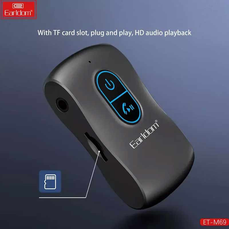 دانگل های گیرنده صوتی بلوتوث به ضبط ماشین یا دستگاههای پخش خانگی که از قابلیت اتصال به بلوتوث بهرهمند نیستند این امکان را می دهد تا با پرداخت هزینه ناچیزی به جای تعویض آنها، از امکان اتصال بی سیم به صورت بلوتوثی بهرمند شوند.دانگل بلوتوث خودرو ارلدام مدل ET-M69، با دارابودن بلوتوث 5.1 و باتری 200 میلی آمپر ساعتی داخلی برای حدود 10 ساعت استفاده انرژی لازم را در خود ذخیره می نماید و از کارت حافظه TF نیز پشتیبانی می کند.گیرنده صوتی چندکاره Earldom M69 دارای یک طراحی بسیار ساده است. یک پورت Type-C در قسمت پایین تعبیه شدهمه مسئولیت شارژ باتری را برعهده دارد. یک جک 3.5 میلیمتری اتصال به انواع دستگاههای دارای این نوع ورودی را انجام می دهد. دستگاههایی مانند ضبط ماشین، اسپیکر، هدفون و .... روی دانگل کلیدهایی برای کنترل پخش مدیا و حجم صدا در نظر گرفته شده که همزمان برای پاسخ به تماس های تلفنی نیز استفاده می شوند.اتصال گیرند خودرو M69 از طریق بلوتوث نسخه بلوتوث 5.1 انجام میشود. وجود نسخه 5.1 از بلوتوث یک اتصال کاملاً ایستا تا فاصله 10 متری را به خوبی تضمین می کند. این محصول Earldom صدا را با کیفیت خوب و بدون تاخیر به گوش شما میرساند.در ضمن این محصول دارای یک میکروفون داخلی است و قابلیت مکالمه دارد. میکروفون داخلی امکان پاسخگویی به تماس ها به صورت هندزفری را برای کمک به راحتی شما در رانندگی فراهم می نماید.باتری لیتیومی داخلی اتصال گیرنده صوتی خودرو هوکو مدل M69 دارای ظرفیت 200 میلیآمپر ساعت است. این گیرنده صوتی ارلدام با استفاده از درگاه USB-C شارژ شده و مدت زمان مورد نیاز برای شارژ آن حدود 2 ساعت است. شما میتوانید تا 10 ساعت با آن موسیقی گوش دهید ویا مکالمه کنید. به علاوه باتری تا 200 ساعت آماده به کار در حالت استندبای را پشتیبانی می کند.گیرنده صوتی خودرو ارلدام مدل ET-M69 سازگار با تجهیزات صوتی با رابط ورودی 3.5 میلی متری (خودرو، بلندگوهای سندبار، هدفون و غیره) بوده و از پخش از طریق کارت TF و بلوتوث 5.1 پشتیبانی می کند. شایان ذکر است که کانکتور 3.5 میلی متری در گیرنده صوتی خودرو فوق قابل جدا شدن است. در صورت عدم استفاده می توانید آن را جدا کرده تا فضای کمتری را اشغال کند.