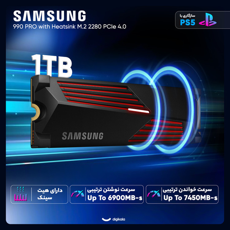 اساسدی اینترنال سامسونگ مدل SSD Samsung 990 PRO ظرفیت ۱ ترابایت با هیتسینک یک ذخیرهساز سطحبالا مبتنی بر رابط PCIe Gen4 x4 است که با تمرکز بر کاربریهای گیمینگ، ورکاستیشن و استفاده در کنسول پلیاستیشن ۵ طراحی شده است. این مدل در فرمفاکتور M.2 با ابعاد ۸۰.۱۵×۲۵×۸.۸۸ میلیمتر ساخته شده و وجود هیتسینک باعث شده مدیریت حرارتی آن در شرایط کاری سنگین پایدار بماند. وزن ۲۸ گرم این محصول نشان میدهد که با وجود هیتسینک، طراحی آن همچنان سبک و مناسب نصب در فضاهای محدود است. استفاده از حافظه فلش TLC و کنترلر بهینهشده سامسونگ باعث شده این مدل از نظر سرعت و دوام عملکرد بسیار بالایی ارائه دهد و در سیستمهایی با بار پردازشی سنگین بهخوبی عمل کند. سرعت خواندن ترتیبی ۷۴۵۰ مگابایت بر ثانیه و سرعت نوشتن ترتیبی ۶۹۰۰ مگابایت بر ثانیه آن را در میان سریعترین اساسدیهای مبتنی بر نسل چهارم قرار میدهد و برای کاربرانی که نیاز به بارگذاری سریع پروژهها، انتقال فایلهای حجیم و اجرای بازیهای بزرگ دارند گزینهای بسیار مناسب است. سرعت خواندن تصادفی ۱,۲۰۰,۰۰۰ عملیات ورودی/خروجی در ثانیه و سرعت نوشتن تصادفی ۱,۵۵۰,۰۰۰ عملیات ورودی/خروجی در ثانیه باعث شده واکنشپذیری سیستم در کاربری روزمره و حرفهای در سطح بسیار بالایی قرار گیرد. این مدل با پلیاستیشن ۵ کاملاً سازگار است و هیتسینک آن برای حفظ پایداری حرارتی داخل محفظه محدود کنسول طراحی شده است. پشتیبانی از قابلیتهایی مانند S.M.A.R.T و TRIM در کنار رمزگذاری AES ۲۵۶-bit، استانداردهای TCG Opal و IEEE‑۱۶۶۷، امنیت و سلامت داده را در سطح قابلاتکا حفظ میکند. مقاومت در برابر شوک تا ۱۵۰۰ جی و میانگین عمر ۱,۵۰۰,۰۰۰ ساعت نشان میدهد این مدل برای استفاده طولانیمدت و حملونقل مداوم مناسب است. با ترکیب عملکرد سریع، پایداری حرارتی ناشی از هیتسینک و امنیت بالا، Samsung 990 PRO با هیتسینک یک انتخاب قدرتمند و مطمئن برای ارتقای سیستمهای مدرن به شمار میرود.