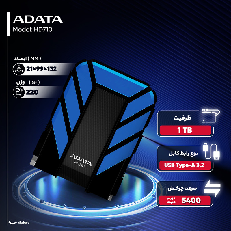 هارداکسترنال «HD710» محصول برند «ایدیتا» (ADATA) است. این هارداکسترنال در زمرهی هاردهای اکسترنال مقاوم قرار میگیرد و مشخصاتی به آن اضافه شده است تا در برابر عوامل بیرونی مقاومت بیشتری داشته باشد. HD710 در برابر ضربه و سقوط از ارتفاع مقاوم است و حتی اگر شدیدترین ضربهها به آن وارد شود، اطلاعات درون هارد به مخاطره نخواهند افتاد. ارتش ایالات متحدهی امریکا این قابلیت هارد ایدیتا را با استاندارد MIL-STD-810G 516.6 تایید کرده است؛ همچنین HD710 از معیارهای استاندارد IP68 بهره میبرد؛ معنای این استاندارد، مقاومت در برابر آب و گردوخاک است. این هارد حتی در صورت افتادن در آب شور هم آسیبی نمیبیند و قطرهای آب به درون آن نفوذ نخواهد کرد. سازندهی محصول تضمین کرده است که در صورت قرارگرفتن در شرایط جوی بیابان، غبار به درون محصول نفوذ نمیکند. اتصال هارد به کامپیوتر با استفاده از رابط USB 3.0 انجام میشود. کابل اتصال این هارداکسترنال به کامپیوتر در شیاری که دور بدنه تعبیه شده است، محکم میشود. این طراحی HD710، احتمال گمشدن کابل را به حداقل میرساند. یک LED آبی روی بدنهی هارد کار شده که روشنبودن HD710 و انتقال اطلاعات را به کاربر نمایش میدهد. این هارد 1ترابایتی دارای رنگبندی آبی، زرد و مشکی است.
