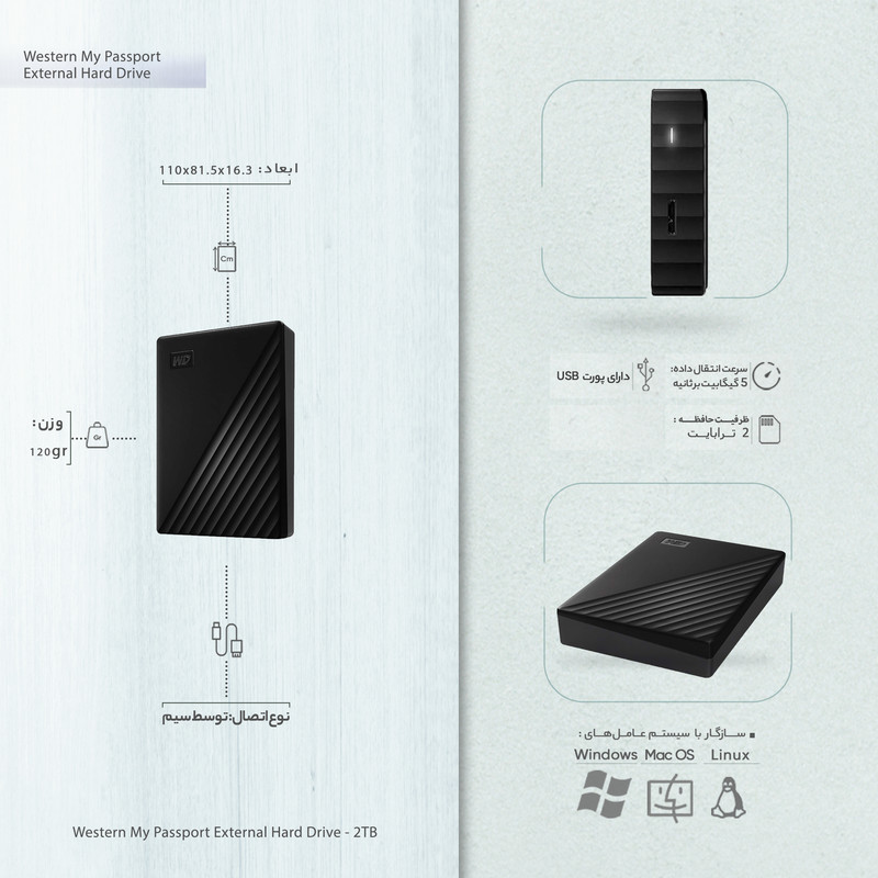 هارددیسک «My Passport» محصولی از شرکت «وسترن دیجیتال» یا همان WD است که در گروه هارددیسکهای اکسترنال قابل حمل قرار میگیرد. این هارددیسک از طریق رابط USB3.0 به رایانه متصل میشود و میتواند اطلاعات را با سرعت زیاد انتقال دهد. سایز هد ارایه شده روی این محصول 2.5 اینچ بوده که سایز استاندارد برای هاردهای اکسترنال محسوب میشود. طراحی این هارد بهگونهای است که هنگام در دست گرفتنش سادگی منحصر به فرد آن هر سلیقهای را راضی میکند. ظرفیت 2 ترابایتی این هارددیسک برای افرادی که اطلاعات زیادی برای ذخیرهسازی دارند، مناسب است. ابعاد بسیار کوچک و وزن مناسب My Passport باعث شده که به راحتی بتوان همیشه آنرا با خود همراه داشت. اگر قصد تهیهی یک هارددیسک ساده را دارید، My Passport میتواند انتخاب مناسبی برای شما باشد. یکی از ویژگیهای این مدل رنگبندی آن است. شما میتوانید این محصول را در 3 رنگ مشکی، قرمز و آبی تهیه کنید. برای افرادی که هاردهای زیادی دارند، استفاده از رنگ بندی برای تفکیک هارد کارایی دارد.