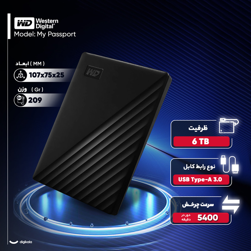 هارد اکسترنال وسترن دیجیتال My Passport با ظرفیت شش ترابایت ترکیبی از فضای ذخیرهسازی بالا و طراحی جمعوجور ارائه میدهد. این هارد قابل حمل با وزن ۲۰۹ گرم و ابعاد ۱۰۷x۷۵x۲۵ میلیمتر، امکان حمل راحت و جایگیری آسان در کیف لپتاپ یا کولهپشتی را فراهم میکند. بدنه مقاوم در برابر خط و خش، ظاهر دستگاه را حتی پس از استفاده طولانی مدت حفظ میکند و نشانگر LED روی آن، وضعیت انتقال اطلاعات را به صورت بصری نمایش میدهد.