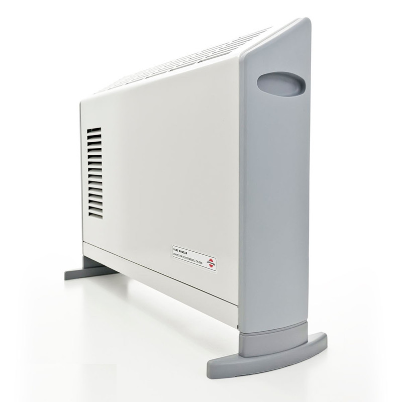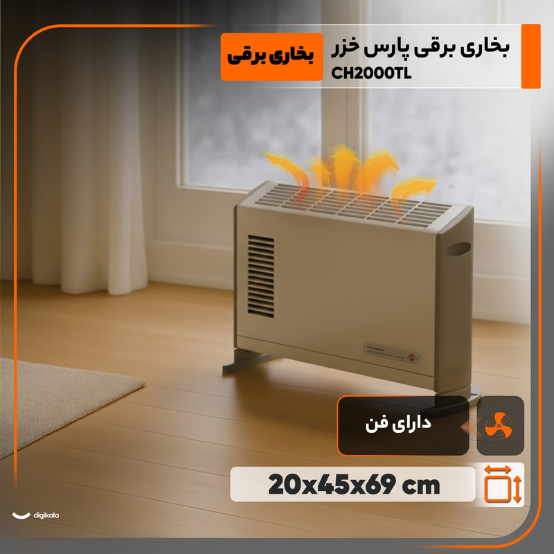 بخاری کانوکتور «پارس خزر» (Pars Khazar) مدل «CH2000TL» محصولی بسیار پرکاربرد با طراحی ساده است که در کنار توان بالا، از قیمت بهصرفهای بهره میبرد. بدنه فلزی این بخاری با پوشش رنگ مقاوم در برابر حرارت با استفاده از تکنولوژی رنگ الکترواستاتیک ساخته شده است. حداکثر توان گرمایشی این بخاری کانوکتور دیواری/زمینی که در ابعاد 690×450 در 200 میلیمتری ساخته شده است، به 2000 وات میرسد. این محصول دارای فن پرقدرت و کمصدا جهت افزایش سرعت انتقال گرما به محیط است. مدل CH2000TL دارای ترموستات تنظیم دما و رساندن دمای محیط به میزان دلخواه و مصرف بهینه انرژی هم است. در این بخاری از المنتهای مخصوص حرارتی با طول عمر بسیار بالا استفاده شده است. این بخاری کانوکتوری، دارای سوئیچ چندحالتی جهت انتخاب توان گرمایی موردنظر است و بهاینترتیب استفاده از آن بهدلخواه کاربر تنظیم میشود. در نظر داشته باشید که پارس خزر، یک شرکت بزرگ ایرانی است که از سال 1347 با همکاری شرکت توشیبای ژاپن، آغاز به کار کرده است. این شرکت در زمینهی ساخت لوازمخانگی در کشور، فعالیتهای گستردهای انجام میدهد.